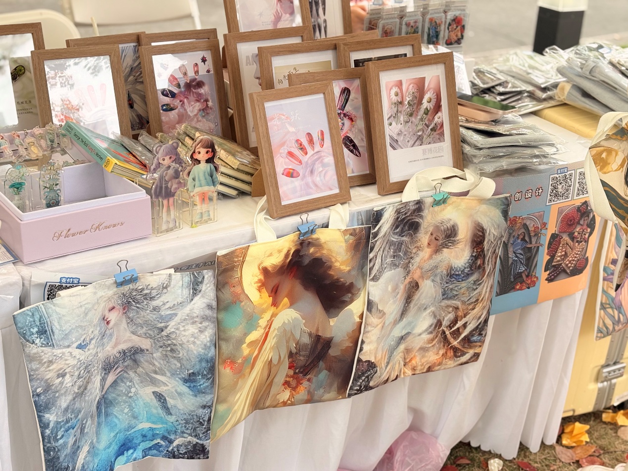 “科技赋能创意、设计成就未来,这是我们一直秉承的理念,通过AI与艺术的融合,我们在打破传统设计的局限,创造新的视觉体验的同时,也融入了丰富的文化内涵,充分展示了人工智能在文化创意产业中的无限潜力。”来自东华大学服装与艺术设计学院2022届的研究生秦紫瑄,毕业后致力于AIGC赋能设计创作,此次她带着线上突破十万成交量的“ONENESS合一设计品牌”来到了本届创意市集现场。