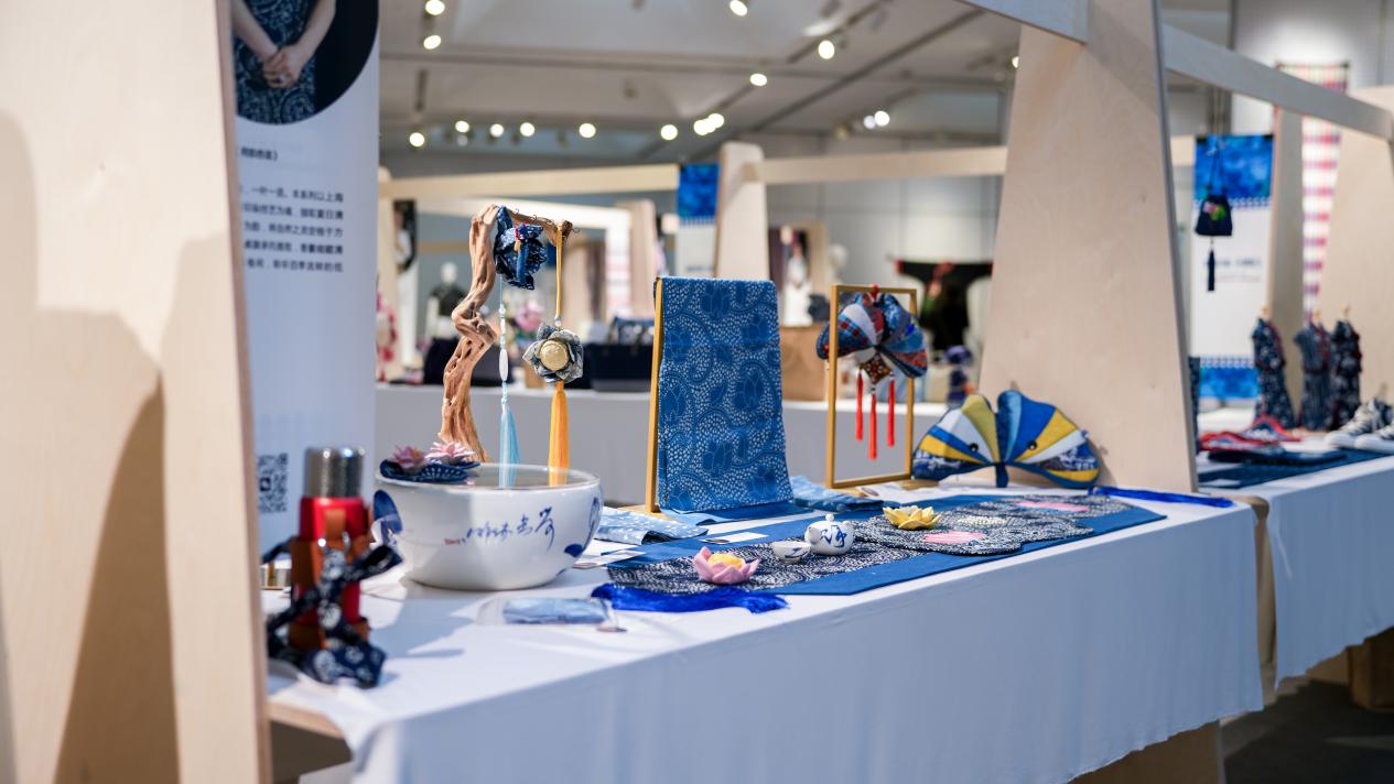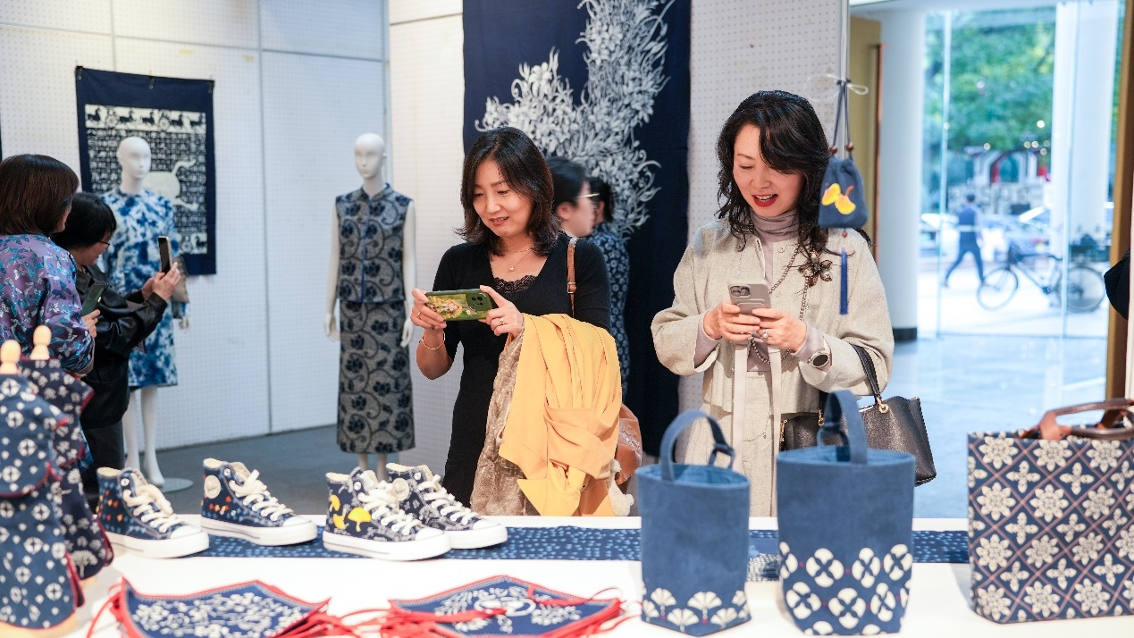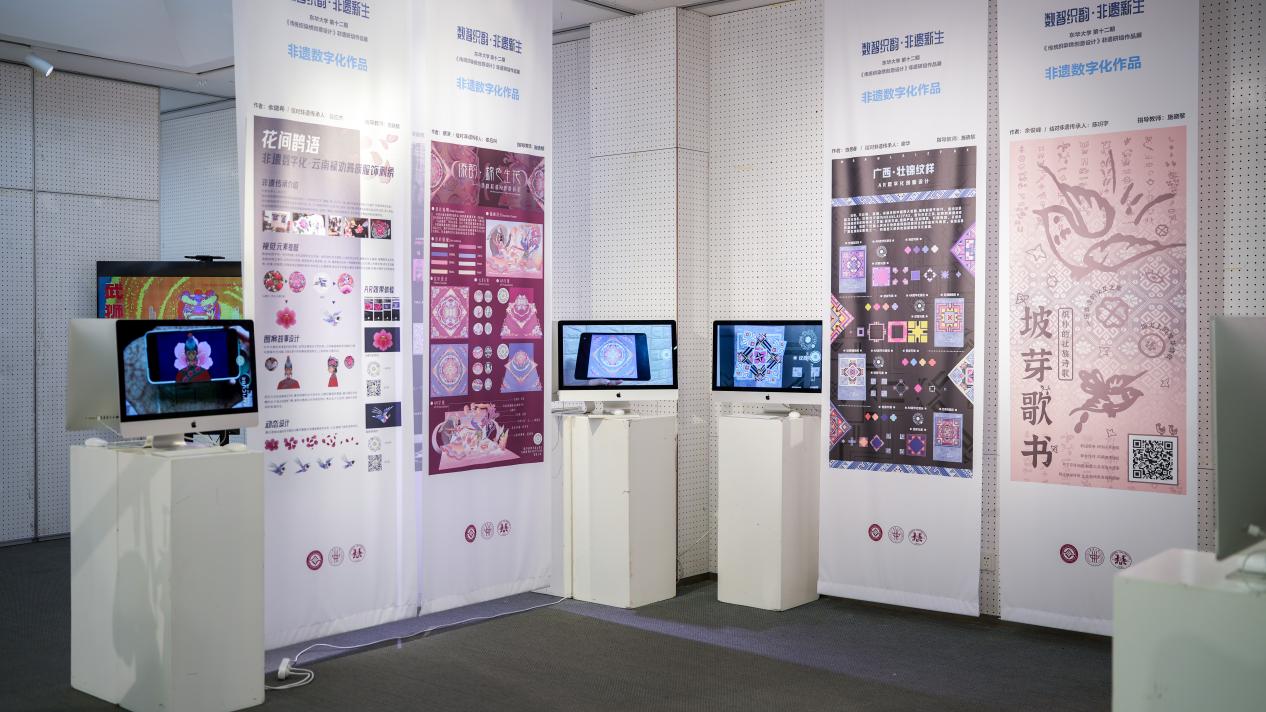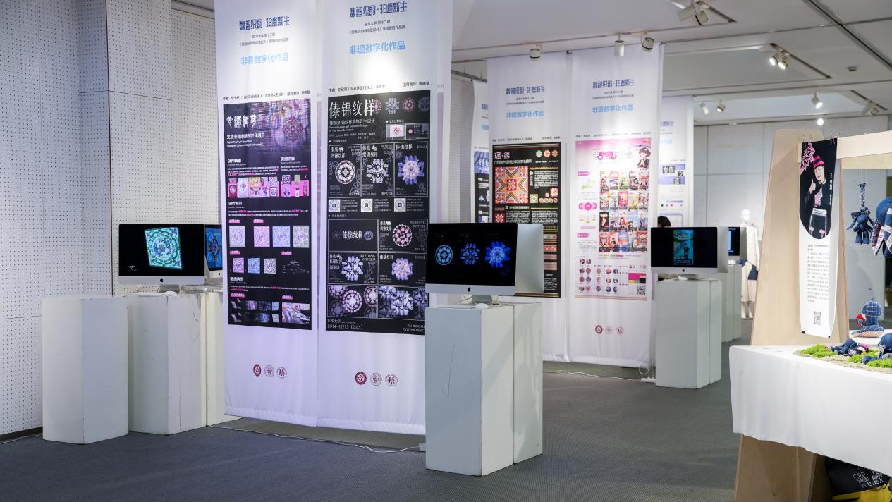 《数智织韵·非遗新生》非遗服饰文创与数字艺术联展同期在校举办,展出400余件具有代表性的传统织染绣面料和纹样样本,以及学员设计创作的服装服饰、文创产品等,把傣族织锦、阜阳刺绣、畲族服饰、上海药斑布印染、崇明土布编织等非遗技艺巧妙融入家居装饰、服饰箱包、国潮周边、IP形象等设计中,还有学员与企业进行合作或计划量产研培作品,实现文化传承的商业落地。