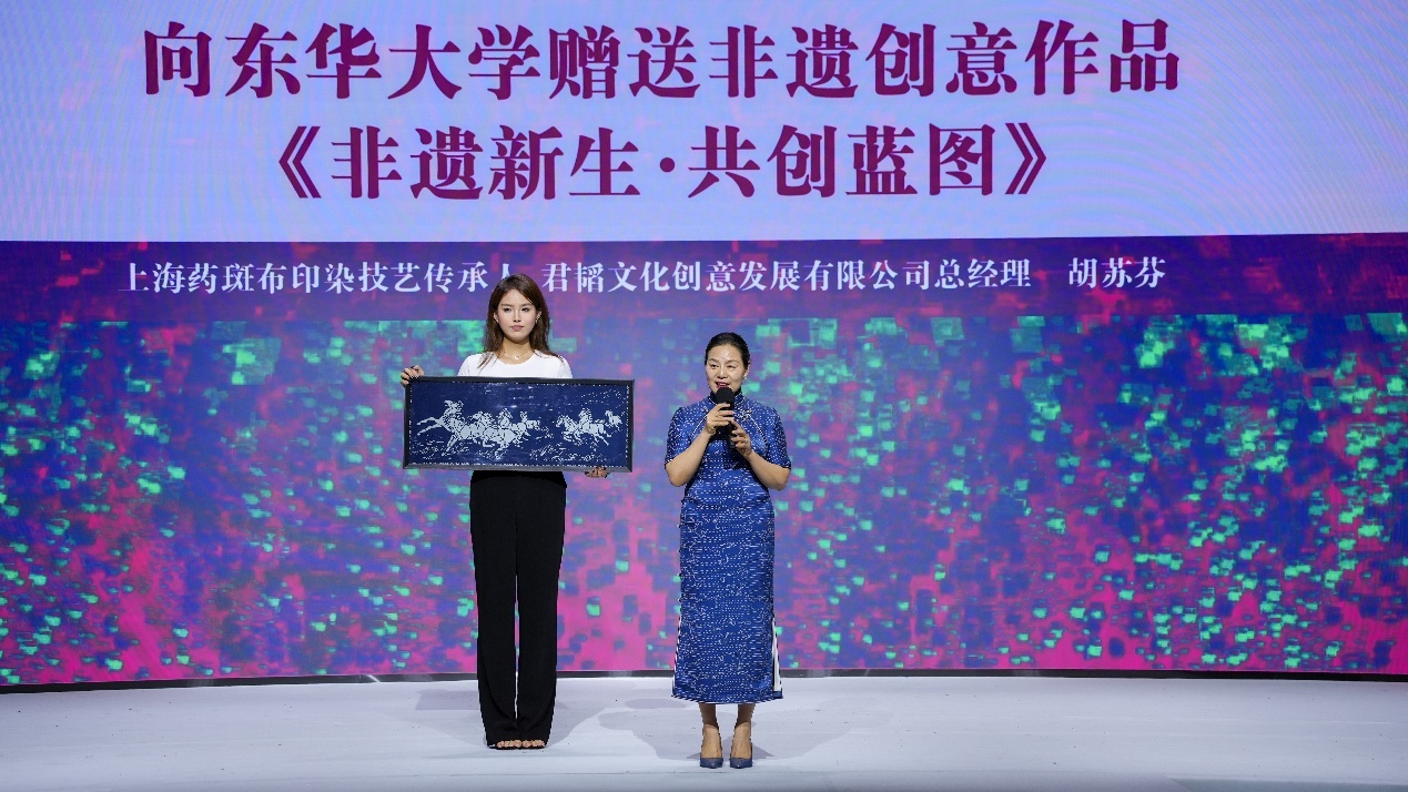本期非遗研培班学员、上海药斑布印染技艺传承人、君韬文化创意发展有限公司总经理胡苏芬代表培训班全体学员向学校赠送精心创作的非遗创新作品——《非遗新生·共创蓝图》,表达对学校的感谢。党委书记刘承功代表学校接受捐赠作品。