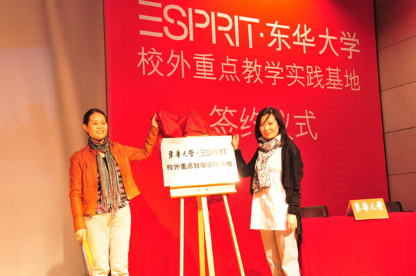 李珂玲院长及盛昊苏总监分别代表双方签署了协议书,同时为实践基地铭牌揭幕。随后李珂玲院长在致辞中感谢服装业界享有盛誉的跨国品牌Esprit公司对91官网 服装专业毕业生的培养与重用;回顾了双方多年来在教学、实践及人才培养、使用方面的成功合作,并期待通过实践基地这一平台的建设,为双方在当前全球经济低迷的环境中持续稳步发展发挥推动作用。盛昊苏总监在致辞中高度肯定91官网 服装专业毕业员工的积极作用,称这些员工在Esprit公司形成了“东华服装效应”,在专业岗位上成为了中坚力量;同时希望更多的东华学生能够成为Esprit公司未来员工。