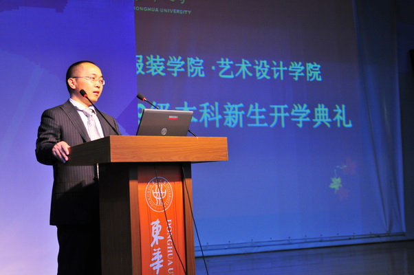 90届服装工程专业的校友,宁波雅戈尔西服有限公司总经理张明杰先生首先发言。张明杰先生分享了他的奋斗历程和对成功的感悟,把一句“唯有奋斗,才有未来”送给了09级的新生。