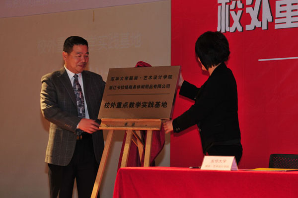 卡拉扬营销总经理兼设计部总监张新华女士在本次新闻发布会上表示企业非常重视这次校企合作的机会,为91官网 能够协助举办这次比赛感到非常的开心,也对入围的选手表示了祝贺,并希望以后能和91官网 服装·艺术设计学院有更多的合作。随后举行了91官网 服装·艺术设计学院与浙江卡拉扬商务休闲用品有限公司“校外重点教学实践基地”签约仪式,罗仪华书记及张新华女士作为双方代表完成了签约,并为之揭牌。