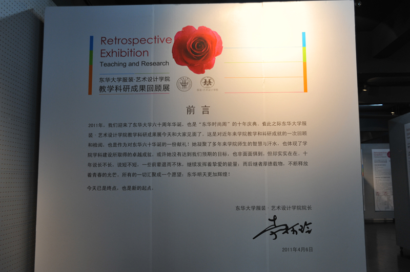服装•艺术设计学院教学科研成果展今天和大家见面了,这是对东华六十华诞的一份献礼!她凝聚了多年来学院师生的智慧和汗水,也体现了学院学科建设所取得的卓越成就!,或许她没有达到我们预期的目标,也非面面俱到,但却实实在在,十年说长不长,说短不短,一些前辈退而不休,继续发挥着挚爱的能量;而后继者厚德载物,不断释放着青春的光芒,所有的一切汇聚成一个愿望:东华明天更美好!