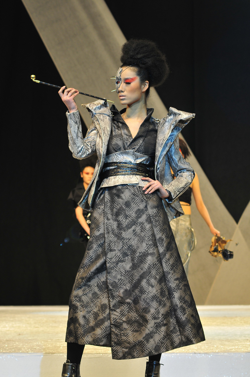 随着悠扬的音乐响起,灯光缓缓照亮舞台,我们迎来了第一部分的展出。当开场模特出现时,那优雅妩媚的羽毛小礼裙,就已经将在场观众深深吸引。粉红色渐变的裙身,高高翘起的头冠,马鞍式的臀部设计,无不彰显着中日班同学在手工和设计上的良苦用心。随后又有以蕾丝为主的短裙,加入折纸艺术的小西装以及雪纺制成的长裙出现,最后几件出场的服装更是集聚奢华与浪漫与一身,婚纱般的公主裙加上羽毛制成的领口带给人如梦似幻的视觉享受。总体来说,第一部分的展出都是以今年的流行色——白色为主,设计也更倾向于女性化的柔美。在人们的掌声中,第二部分开始了。这几十套衣服明显更具时代感,银灰色的大量使用和紧身收腰的设计,再加上金属搭扣,绑带的点缀让人们感受到了都市摩登女郎的气息。从第三部分开始,女装一统天下的局面被打破,出场便是四套以黑白为主的男装。其中有一套男装故意将裤腿挽起,露出了鲜明的红袜子,严谨的西服上装和带着戏谑的下装体现出了设计者的匠心独运。接着就是几套凸显名媛气质的套装,狐狸围脖起到了很好的修饰作用。在此后的设计里,日本熟稔的解构设主义得到了极大的应用,长短不一的裤腿,只有半边的小西服都让人们赞叹。在第四部分当中,之前隐隐约约的朋克,摇滚元素都凸显出来,很多服装都以黑色为主,皮革得到了大量的应用。中间还穿插着精妙的褶皱和闪光的金属配饰及夸张的育克、衣领。男装被融进了女装,使女装更具有了阳刚之美。第五部分,可谓是今晚最特殊的了。插满管子的“太空服”、夸张怪异的动物造型、像“中国馆”一样的帽子,无不体现出设计者天马行空的想象力。总的来说,很多同学都偏向于朋克、哥特的设计风格,在经典中追寻流行并加入自己的独到的理解,大胆的应用各种材料去完成自己的想法,其严谨精巧的手工工艺和时尚独特的设计,都使得本场秀获得巨大的成功。