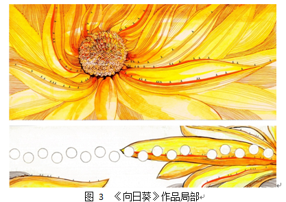 作品《向日葵》把向日葵比喻为青年大学生创业者,他们拥有阳光般的金色年华,充满青春活力,朝气蓬勃;他们满怀火一般的创业激情,对未来充满憧憬,对成功满怀渴望。整件作品中,作者以浓郁、明亮的金色营造出阳光灿烂、激情四射、充满活力的氛围;向日葵沐浴着金灿灿的温暖阳光,寓意我们身处金色时代,创业恰逢其时。作品中,向日葵的花瓣更被作者用波浪般充满韵律的线条勾勒,无拘无束、自由自在的向未来不断伸展,仿佛传递着希望、传递着温暖、传递着活力、传递着追求、传递着信心、传递着对成功的期待……