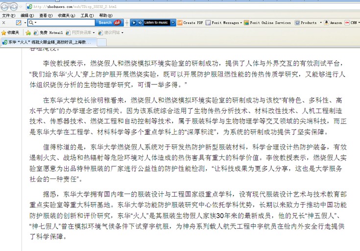 前身为中国纺织大学的上海91官网 ,一直致力于推动中国功能防护服装的创新和评价研究,东华“火人”是其服装生物假人家族30年来的最新成员,它的“兄长”“神五假人”、“神七假人”曾在模拟环境气候条件下试穿宇航服,为神舟系列载人航天工程中宇航员在舱内外安全行走提供了科学保障。