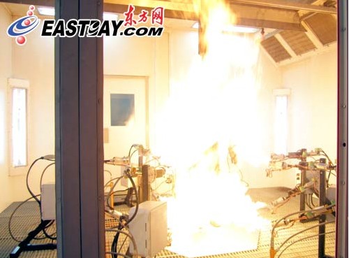燃烧模拟环境实验室的科研人员向大家作了现场演示:只见在燃烧假人的周围共安装了6组12只喷火器,每个喷火器可在2-3秒内提供出巨大的热流量,逼真模拟真实火场危急状态的爆燃闪火。实验中,所有喷火器一齐点火,12条火龙腾空而起,身着防火服装的燃烧假人瞬间即被高达3米的烈焰吞噬淹没。