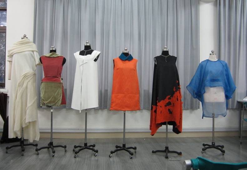 将草图变成实物的过程十分不易但又相当具有探索性,在第二周的课程中,大部分的时间安排给同学们自己进行服装的制作,同学们在制作过程中不断完善自己的构思,摒除一些无法实现的设计,并通过与老师一次次的交流,将思想完完全全呈现在自己的作品中。