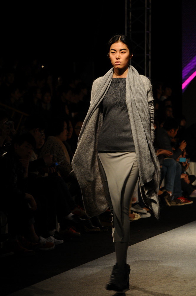 整场发布会总共分为两个部分,秋季部分以灰色、黑色、白色为主,冬季则以棕色系为主。首先出场的一组以墨色为主,墨色的长裙搭配黑色的高跟鞋,或是墨色背心搭配九分裤以及短筒皮靴,服装整体宽松而素雅。之后出场的一组灰色系作品非常明显地加入了一些草本书签的元素。写意却精致小巧的印花来自于草本书签上陈旧而斑驳的印记,颜色的晕染和水洗加上款式上别出心裁的剪裁使得作品飘逸而优雅。同时罗竞杰老师对于服装在秋季中的厚薄程度的拿捏也恰到好处。从初秋的凉爽到深秋的一丝凉意,服装也随之不着痕迹地从最初飘逸的长裙和背心渐渐演变为长款毛衣和长款的毛衣外套。而颜色上牛仔蓝或深灰色上衣和细碎花纹的搭配,以及蓝白晕染和纯白色的搭配使得作品整体给人一种水墨画的轻盈和大气,这一点和之前在2012年4月21日罗竞杰老师在本校另一场以“水•木”为主题的发布会中以“水”为主题的作品有异曲同工之妙。