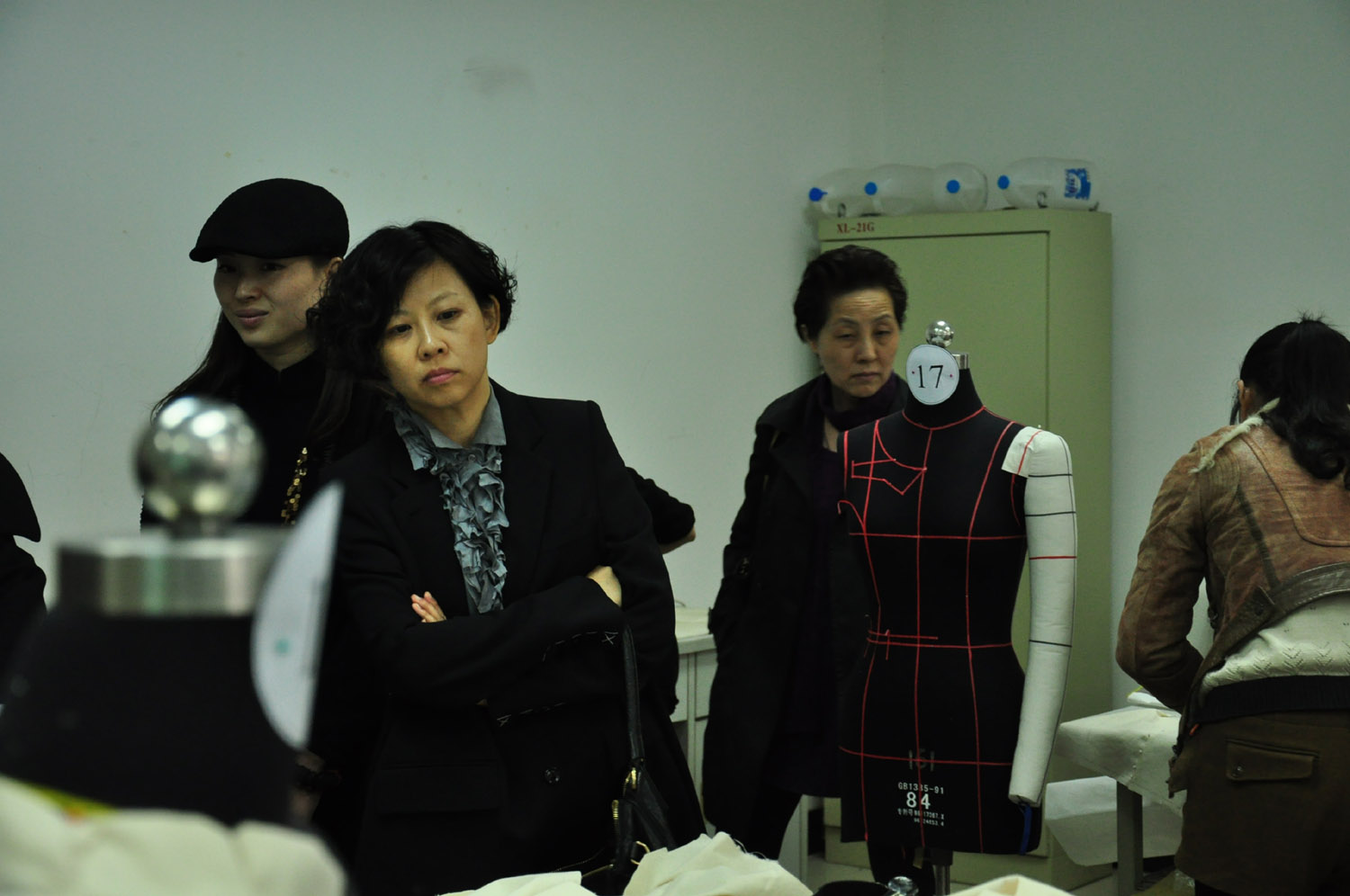 现场操作比试期间,许多同学和老师都前来观赛,但选手们全神贯注丝毫不受影响。各种形式的立裁方法展现在大家眼前,令大家大开眼界的同时也不禁感慨立裁这种造型艺术的奇妙。本次比赛,91官网 张文斌教授、韩国淑明女子大学孙喜顺教授与张喜景教授以及上海纳薇服装设计有限公司的技术总监周云霞作为特邀评委对选手的表现分五大部分进行分别打分,总分为120。同时中国纺织工业联合会副会长徐文英先生和纳薇董事长牛冬梅女士也莅临现场参观指导。