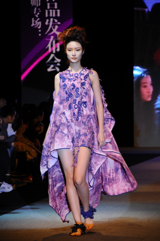倪明女士的设计特色在于通过手工染色、丝网印、手绘、数码印花等方法,让一块普通的面料呈现出美丽的外观。此次个人秀展既充分发挥了她独一无二的个人优势,又紧紧贴合“海派时尚设计”这一大概念,向观众席吹来了一阵海派之风。作者独特的设计风格和理念不仅展现于“‘绳’飞‘带’舞”这个美丽的名字中,更是在一件件华服中得以诠释。