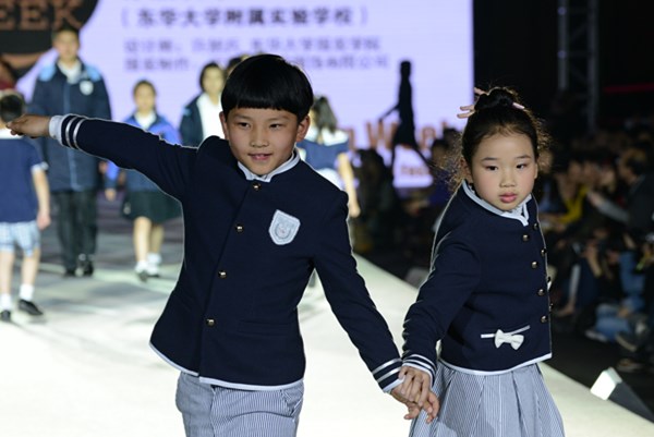 附属实验学校的学生向我们展示了春夏秋冬四季的靓丽校服,可爱、活力、青春的气息扑面而来。小西服与衬衫的组合,大面积苏格兰条纹的运用,连帽红色卫衣与连衣裙的搭配……设计师紧抓各个年龄阶段的不同特点,用水手服、小西装、改良中山装,演绎着学生生理、心理成长的过程。让我们不禁感叹设计师对各种色彩和款式的熟练运用和对年龄心理特点的准确把握。