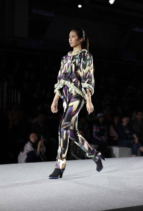 在展演中,有一个系列的服装显得很特别。它以“孔雀”为主题,却没有采用如孔雀羽毛般华丽的色彩,反而非常干净、简洁。在采访中我们得知,设计师的灵感的确来源于孔雀,但欣赏的是孔雀的精神与柔美的线条,而不在乎其颜色。看起来简单的衣服,其实使用了针织、皮革、麻、鸵鸟毛等诸多面料的结合,力求材料、配饰、衣服的整体和谐与美感。另外引起轰动的有采用太空棉与编织面料拼接的一组服装。其中一套上身包身,下身小廓型的服装,既表现了曲线美,又富有时尚感。袖口处的编织部分,配以绑带流苏,增添一份随意和可爱。