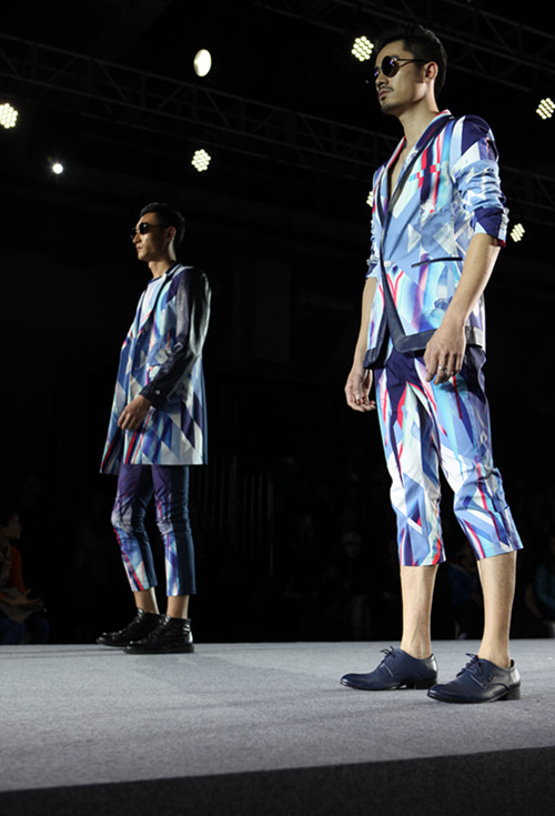 袁沁旻同学获得了结构设计奖,以建筑廓形分割为灵感,运用拼接,分割线剪裁,增加服装层次感,融入浓郁的英伦复古气息;红蓝撞色印花,展现男性桀骜不驯的气质;粉绿搭配,年轻而充满活力,给舞台带来别样的风采。
