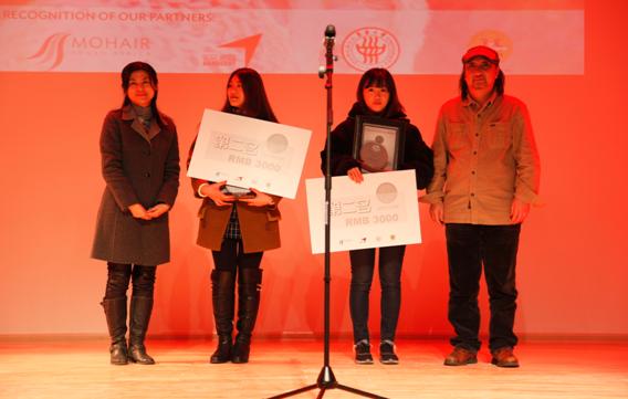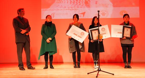 图2 南非马海毛协会CEO Deon先生、服装艺术设计系主任汪芳为三等奖周玮、洪倩雯、沙河同学颁奖