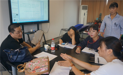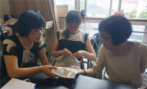 (学员们在讨论刺绣作品)