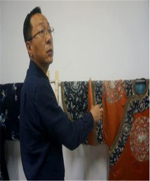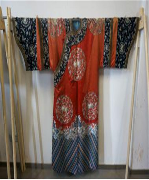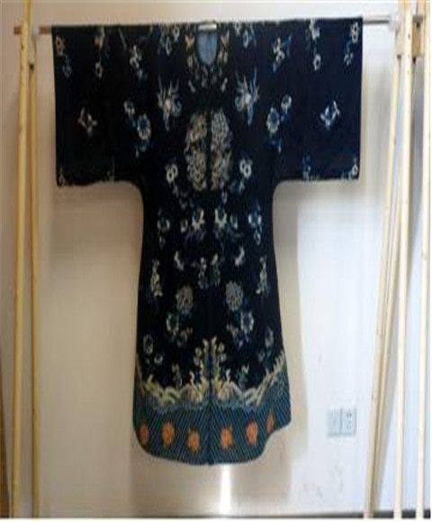讲课结束后,卞老师给学员们分析了两件经典的清代服装,其中红色衣身的是19世纪清代诰命夫人正式场合所着,衣服宽大,胸围接近50cm,袖口更是达到40cm左右。中央绣有蝴蝶环绕的仙鹤图案,下摆绣精致的海水江崖图案;深蓝色的一件同是女装,在平时生活的正式场合穿着,为三蓝色绣花,图案变化丰富,下摆所绣的海水江崖相对较简约。