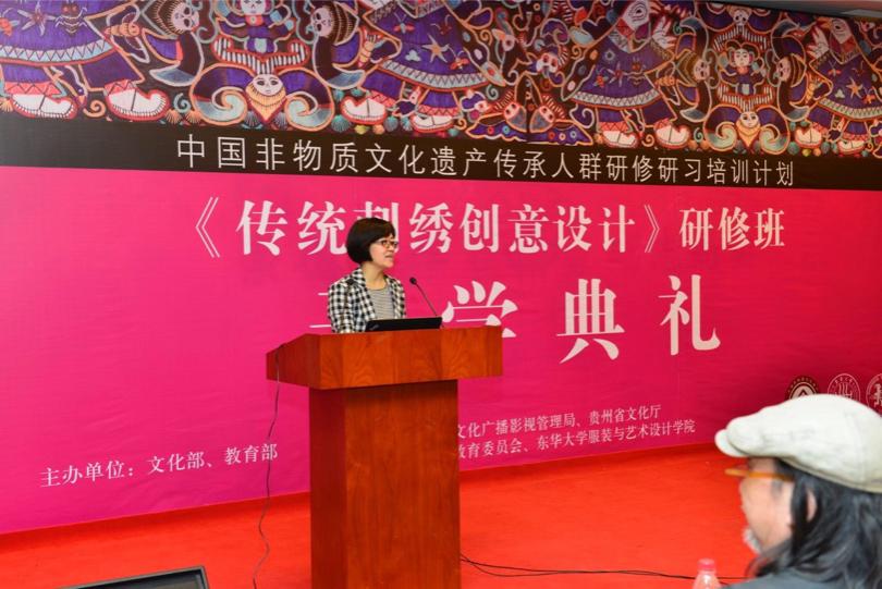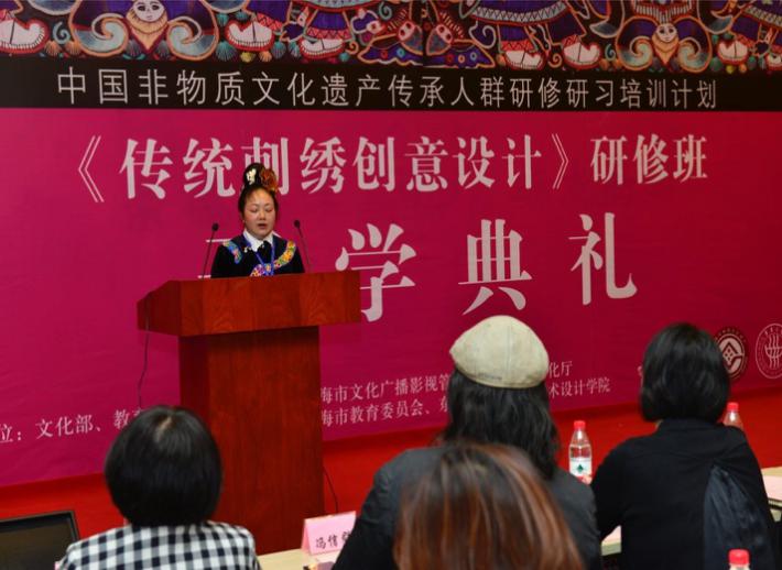 贵州传统刺绣传承人、也是本次研修班班长高成春代表全体学员用纯朴而真挚的言语表达了对所有领导及老师的感谢,以及对本民族刺绣文化的热爱,表明将带领来自于贵州的20多位资深绣娘在此次研修班期间一同认真学习与研究。