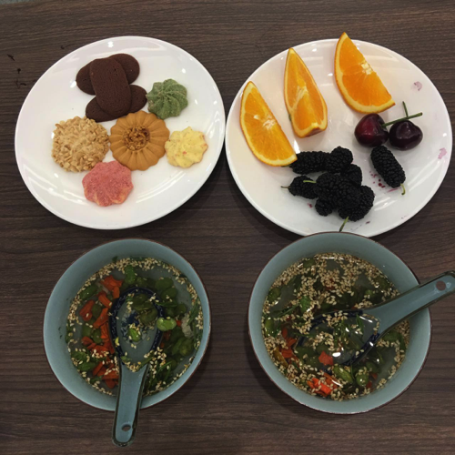 震泽镇副镇长卢斌煜与党委办主任王磊邀请学员们品尝震泽特色的非物质文化遗产熏豆茶,色香味美,细细品味咸中带甘。在开展小型座谈会中,镇长向学员们介绍蚕乡震泽的发展史,建设生态新城,弘扬“丝绸文化”的特色建设事迹。在改革开放后,养蚕业得到政府的大力支持,缫丝厂、养蚕厂大量兴起,曾出现家家户户手作蚕丝被的景象。在座有很多学员在家乡都有自己的企业,规模不小也有和企业有一定的合作。但由于路程遥远所以刺绣的原材料贵而色少,傅老师提出合作的建议,建议推进培训班和企业的合作,深化学员们的实践创新能力。