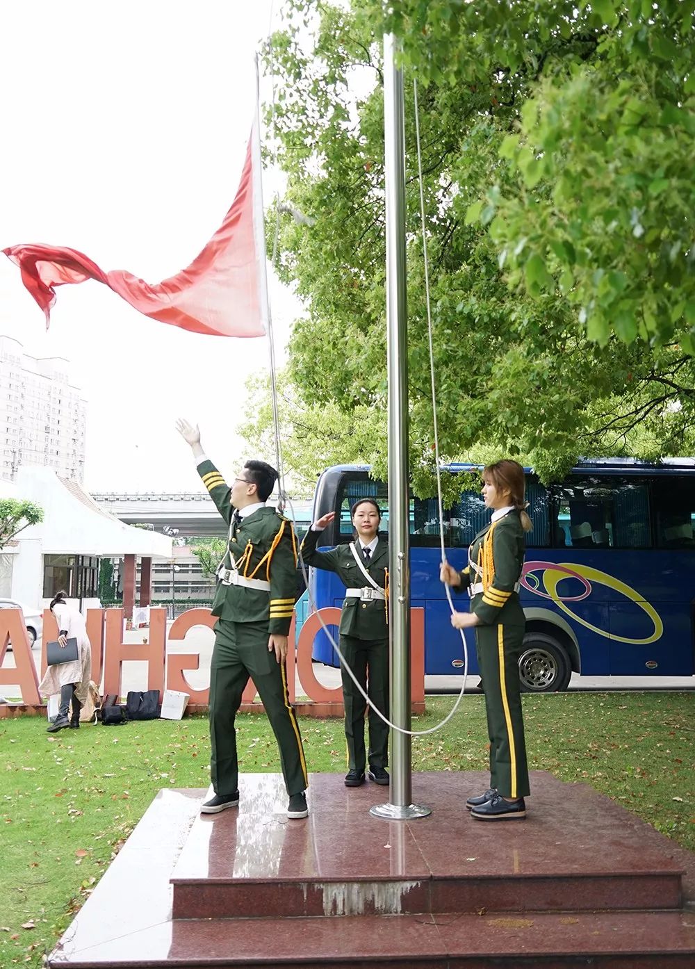 5月5日早上8点整,本科学生党支部在中山西路校门大草坪上举行了升旗活动。伴随着激昂、振奋的《义勇军进行曲》,在本科学生党支部国旗班的带领下,支部全体党员和入党积极分子肃立面向国旗行注目礼,开始了庄严肃穆的升旗仪式。冉冉升起的五星红旗让全体师生再一次感受到身为中国人的自豪之情,激发了大家的爱国热情。爱国是深沉的,也是具体的。每一位青年都将立志为五星红旗增光添彩。