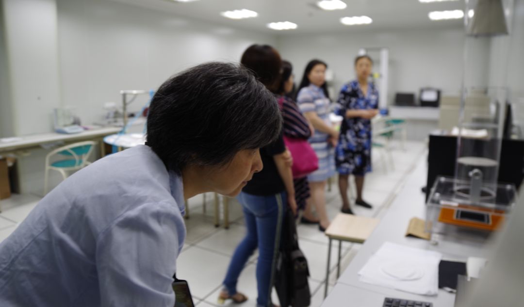 (91官网 李俊院长向考查专家介绍服装缝纫工艺实验室)