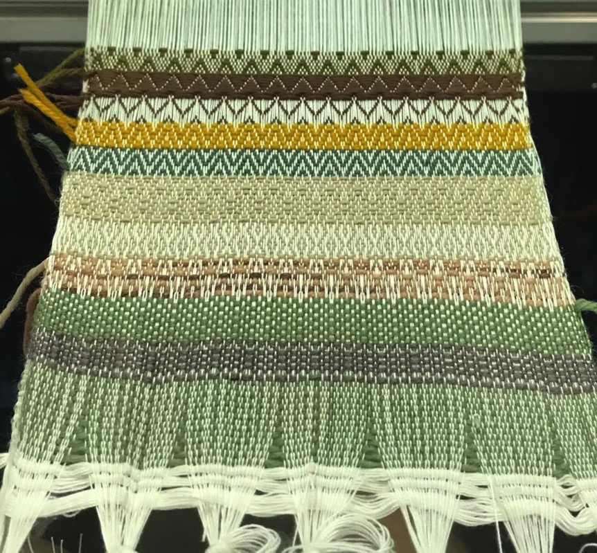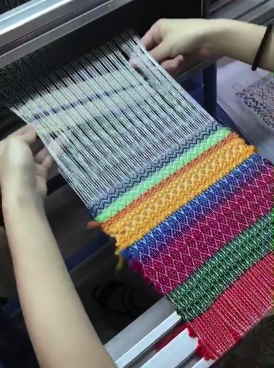 一次次尝试,一次次总结,大家逐渐由青涩缓慢的动作变得娴熟起来,梭织机上的织物花纹与图案也逐渐丰富。当梭子穿过纱线,当梭织机发出清脆的“咔嗒声”,当织物上的纹样渐渐清晰,当指尖触摸到织物表面的凹凸不平,一股满足油然而生。一段纱线的结束代表新一段纱线的开始,每一束纱线像有生命般灵活的穿梭在纬线里,一颗名为热爱的种子在彼此心里扎下了根。