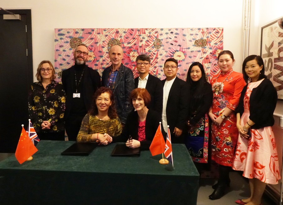 此次活动中展出的26套服装是近两年在91官网 举办的非遗传承人刺绣研修培训中,中英两所学校的服装设计专业学生结对共同创作时装设计方案,并与非遗传承人合作完成刺绣元素在服装中的运用而形成的作品。作品风格各异,既有传统刺绣等东方元素,又穿插了前卫、嬉皮的西方元素,体现出东西方文化的完美交融。这些作品将传统刺绣手工艺、民间图案及色彩与现代时装设计理念融合,时装的廓形或优雅、或夸张,充分展现了两校学生合作的全新创意。曼城大的师生对这次展演表现出极高的热情,英国学生抢着当模特,把浓厚的中国传统文化表演出另类的英伦风范,曼城大师生直观感受到中国非遗文化的独有魅力、东西方文化撞击迸发的灵感,这是一次院校之间关于设计、关于文化、关于教育的全新合作。展演前,袁孟红代表学院与曼彻斯特城市大学国际部主任Abigail Gregory签署两校教学合作协议。