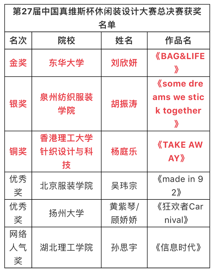 10月27日,第27届中国真维斯杯休闲装设计大赛总决赛亮相中国国际时装周舞台,在北京751D·PARK第一车间拉开了帷幕。本届主题——“趣•共享”,旨在通过设计,传达时下最新、最热的共享时代。在本次大赛的总决赛现场,从东、南、西、北四大分赛区成功晋级的20位设计新秀巅峰对决,向本次大赛的最高奖项发起终极挑战。最终,来自91官网 中日合作班2016级的刘欣妍同学,凭借其作品《BAG&LIFE》捧得本届大赛总决赛的金奖。选手通过明快的色彩与多样的解构手法,完整地将玩趣生活及大众休闲服饰的创新思维进行融会贯通,完美呈现。