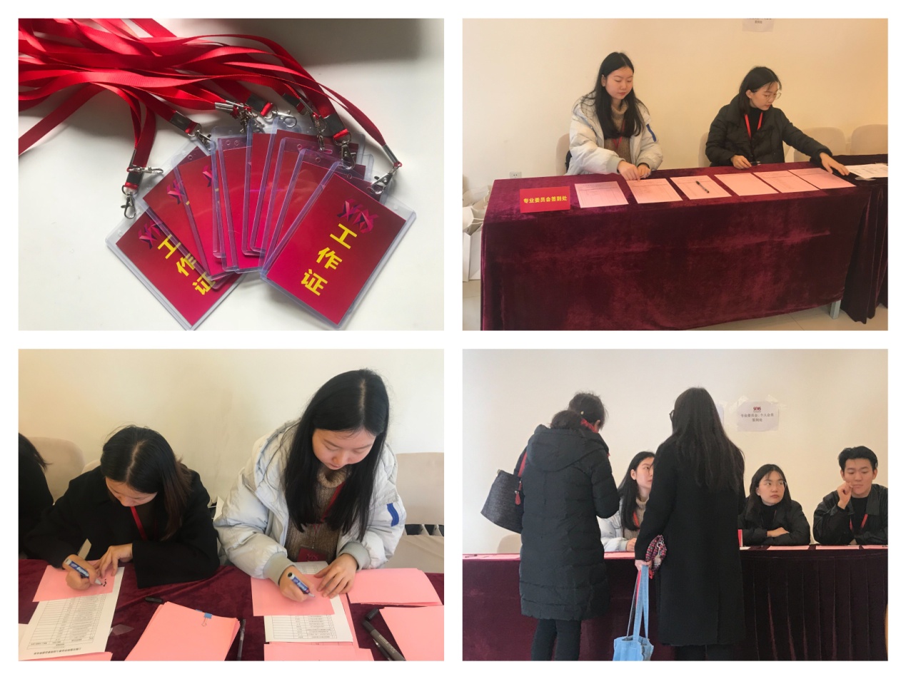 会场布置完毕后,工作人员回到各自的岗位,负责引导、签到、播放视频音乐、收发选票等等。