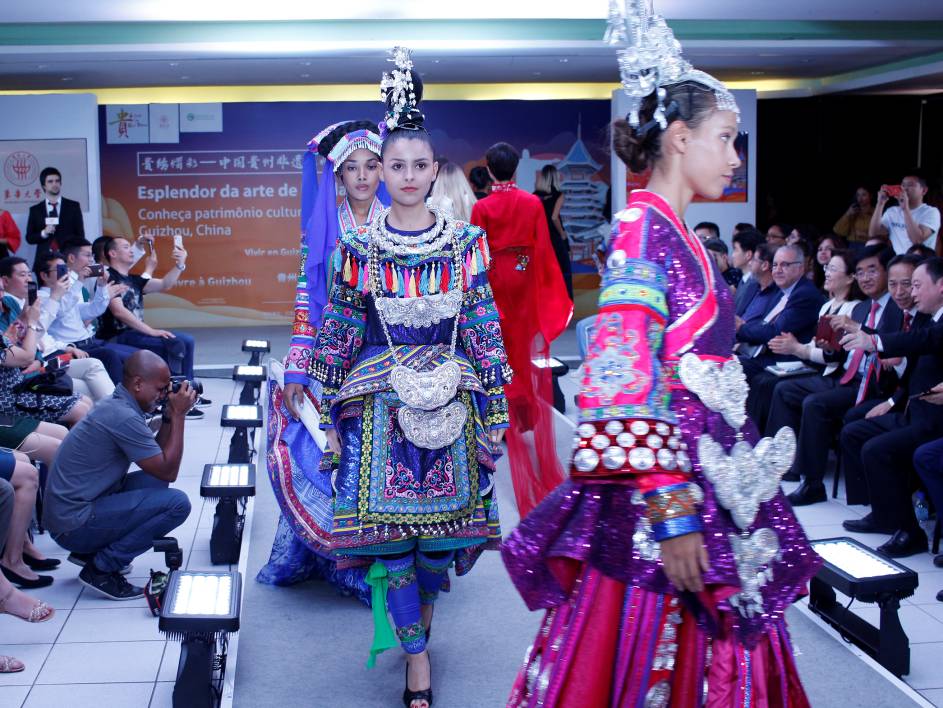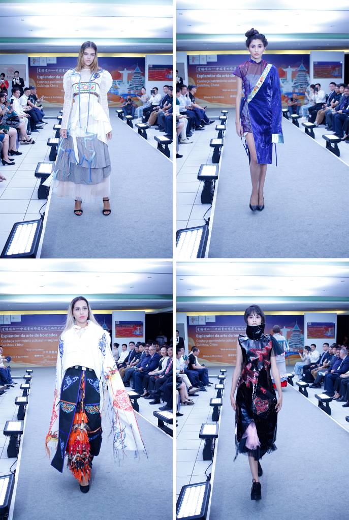 来自巴西的模特现场展示的“贵绣”服装包括27套由91官网 “传统刺绣创意设计”培训班的同学们设计的服装, 12套贵州苗族蜡染服饰和3套贵州民族服饰,受到在场观众的热烈欢迎和广泛好评。