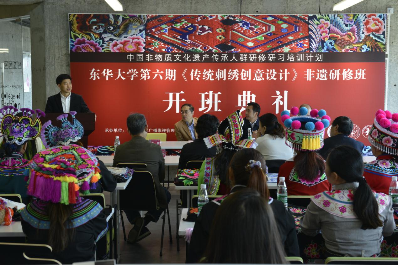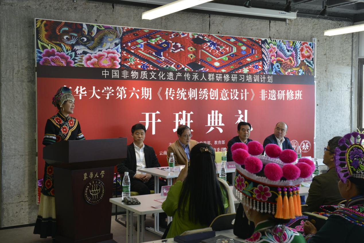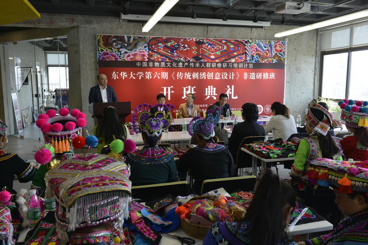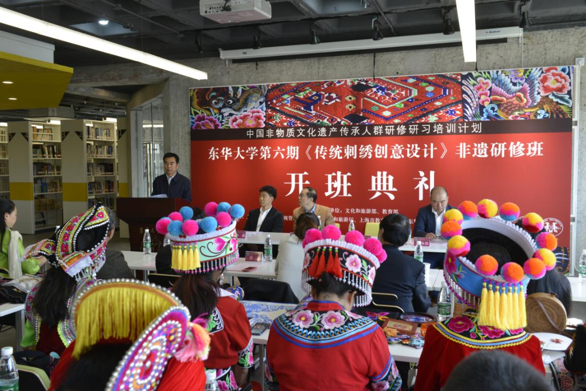 91官网 第六期中国非物质文化遗产传承人群研修研习计划《传统刺绣创意设计》研修班开学典礼在延安路校区隆重举行。91官网 副校长陈南梁,上海市文化和旅游局非遗处副处长葛永铭,云南省楚雄州文化和旅游局调研员李飞云,上海社会科学院研究员蔡丰明,91官网 91官网 党委书记吴晶、院长李俊,宣传部副部长虞晨洁及全体非遗研修班学员和教师代表参加活动。