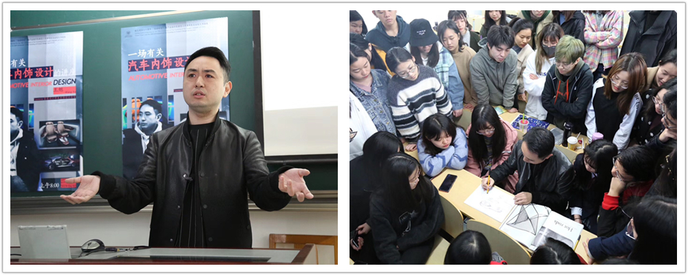 Faurecia首席设计师、产品设计系校友王旭在《一场有关汽车内饰设计》的讲座中,以毕业以后的职业发展生涯为引线,为大家详细介绍了汽车行业、汽车内饰设计的专业知识、就业前景,同时还现场展示了汽车手绘技法,瞬间让讲座氛围达到高潮,最终他在现场演示了汽车设计构思的手绘表达过程。