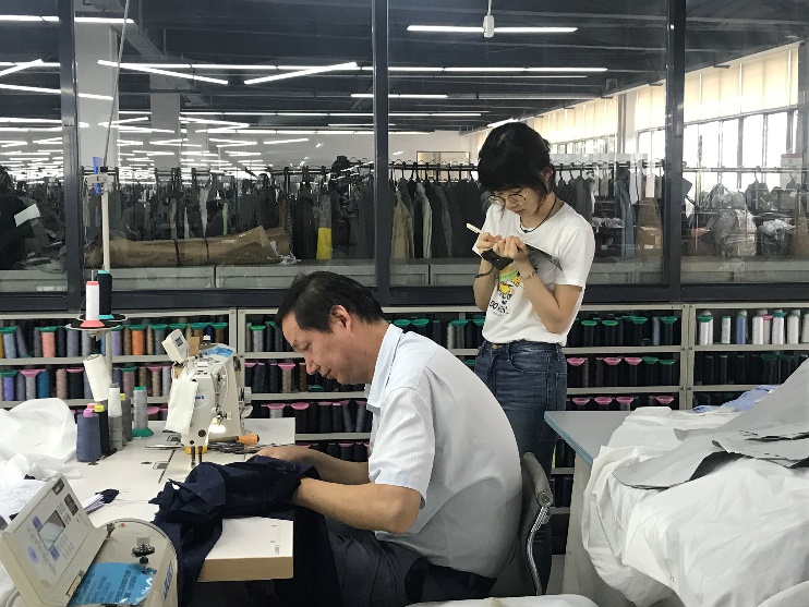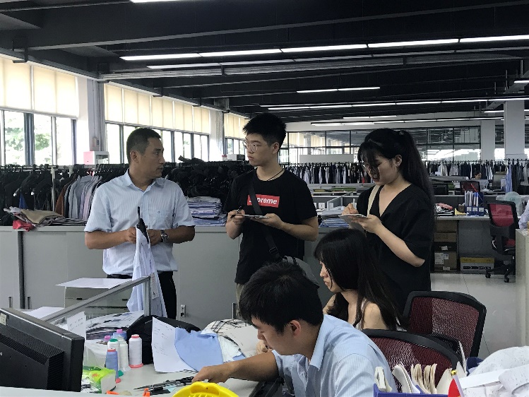 6.27日,在晨风技术部门的协助下,学生开始为期三天的部门轮岗实习,分别从制版、工艺、裁剪、缝制和后道五个方面,全面了解服装生产各个环节的作用和相互关系,深入学习技术技巧。实习过程中,师傅们对同学热情友好,认真回答每个问题(图5-图8)。学生能够将课堂知识与生产实践相结合,有助于今后更好的进入工作岗位。