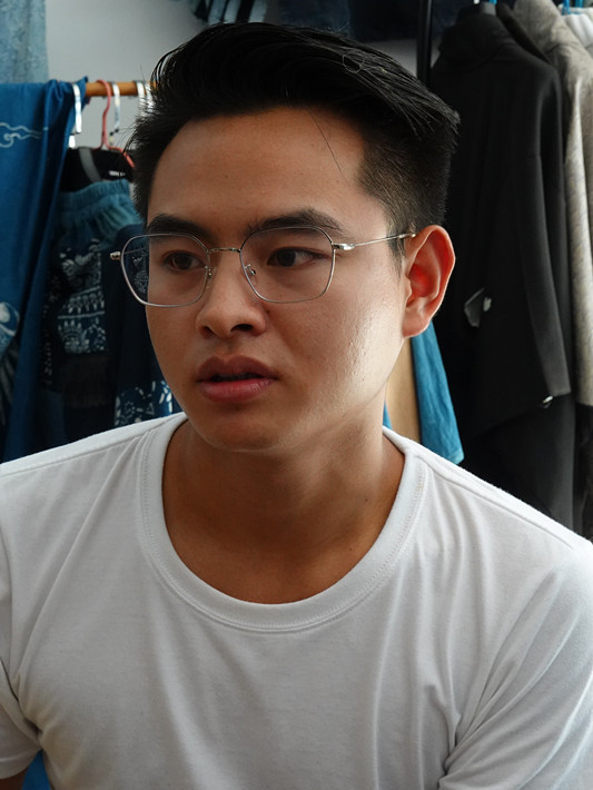 回访王艺,是一次不期而遇。他不在本次回访名单中,一是因其非布依族学员,二是因他是由贵阳市推荐到91官网 学习,兴义非遗中心的名册中也没有他,三是因为他所擅长在扎染、设计,并非布依族刺绣。但7月28号那天下午四点多在我们回访结束返回住处的路上,路过兴义著名景点万峰林景区,同行的傅老师说,我们还有一位学员店就开在这个景区,于是立刻决定过去顺访王艺。