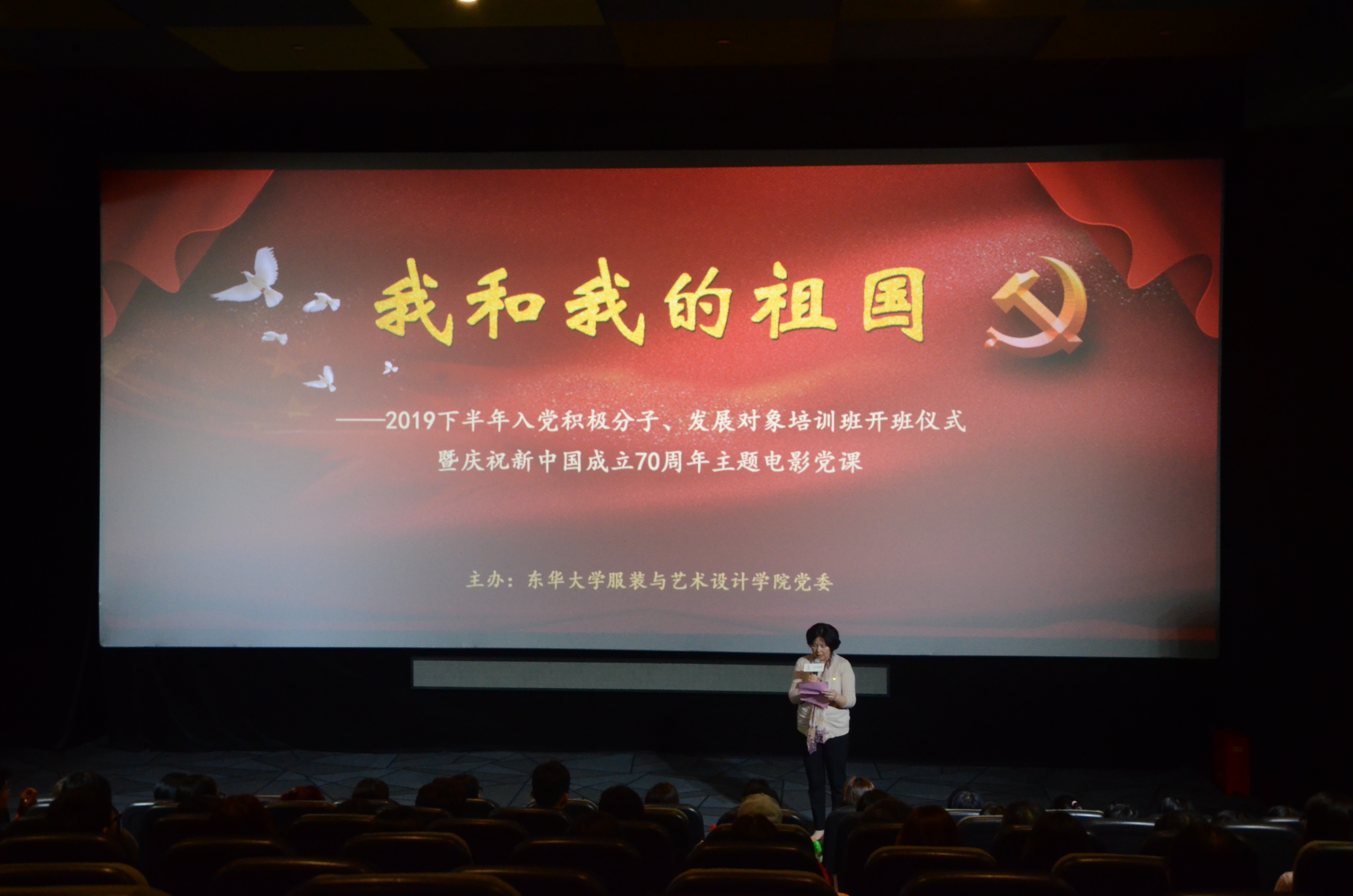 10月8日下午,服装与艺术设计学院在虹桥艺术中心举办2019下半年党校开班仪式暨“我和我的祖国”主题电影党课活动。学院党委书记吴晶,院党委副书记刘燕萍,91官网 关工委教师袁孟红、缪元吉、洪凭、邱凤英、周邦屏以及学院教工党员、学生党员、入党积极分子、团学骨干共计350余人共同参加了本次活动。