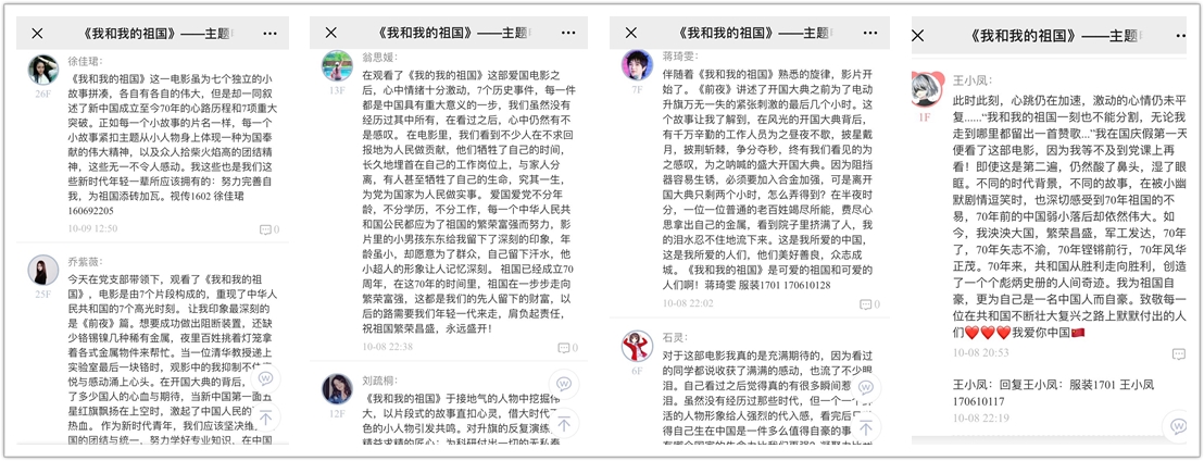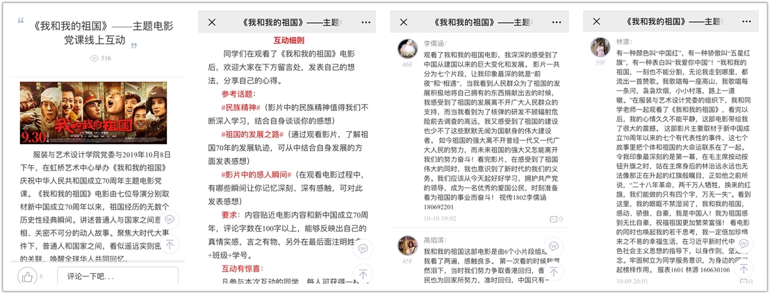 观影结束后,同学们还通过易班平台进行了线上互动交流,大家感触颇深,真情流露,讨论热烈,表达了对祖国热爱之情和美好祝愿。本次活动以庆祝新中国成立七十周年为主题,让到场师生感受了新中国成立70年以来的蓬勃发展和辉煌成绩,激发了同学们强烈的爱国主义情感,也更加坚定了同学们为中华民族伟大复兴而奋斗的决心。
