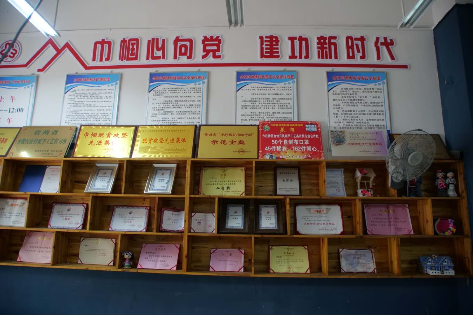 公司的荣誉墙也很有气势(图3),近年来,韦厚珍带领的团队先后荣获“国际新手工艺运动”优秀奖,贵州省“乡村振兴巾帼行动”示范企业、六盘水市妇联“十佳绣娘”等荣誉称号。2019年,韦厚珍入选全市诚实守信“身边好人•凉都榜样”等等。仅20182019年间就获得数十种奖项。老师尤为看中的是韦厚珍参加了两届“多彩贵州民族服饰设计大赛”,每次都赛绩不凡:2018年获得“民族元素职业工作装”三等奖、“民族元素旅游休闲装”优秀奖,2019年获得“民族元素职业装工作装”二等奖、“民族元素旅游休闲装”优秀奖。91官网 的非遗研培主题为“传统刺绣创意设计”,以提升学员设计能力为宗旨。韦厚珍学成归来融会贯通,效果显著,让回访组老师甚是欣慰。