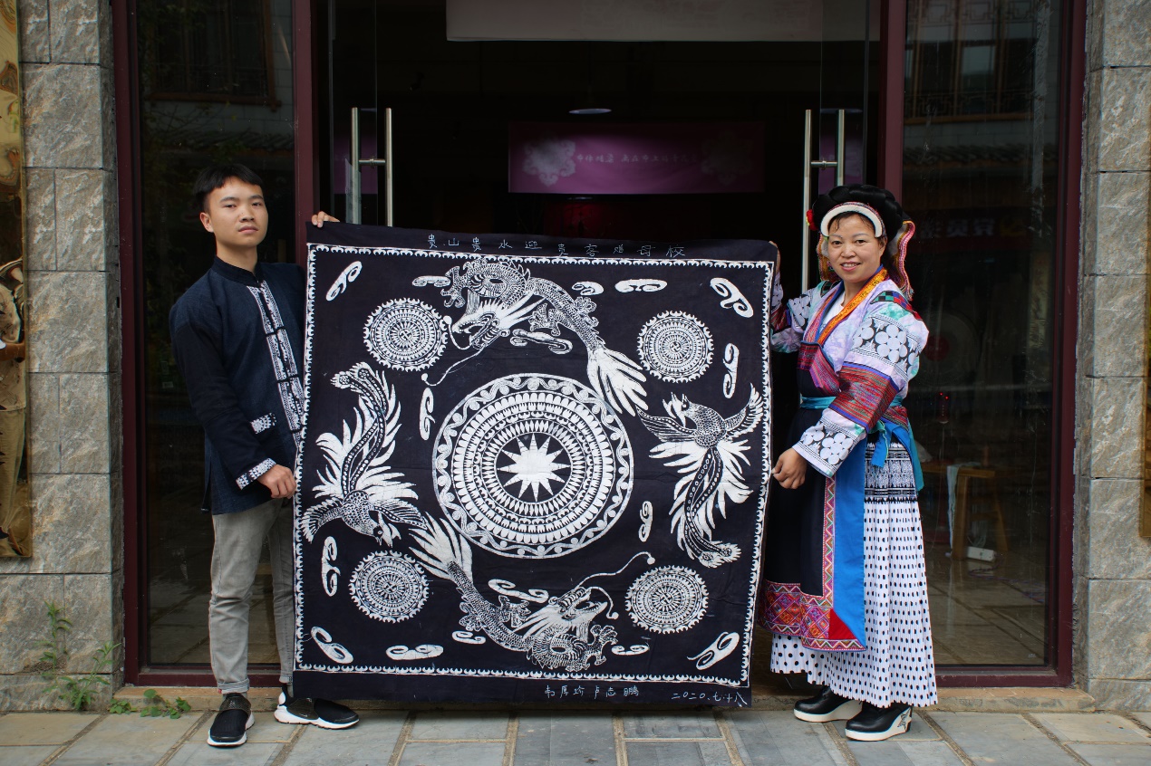 回访老师认真听取了两位学员的研培学习心得和公司的运行现状、并对下一步如何开发新品提出了具体建议、指导其扩大品类和提升层次。柯主任将新鲜出炉的第七期《91官网 非遗研培成果》赠与卢志鹏留念(图4),看到自己在东华的学习生活以及研培成果被如此精心地保存成册,小卢学员非常激动。对于91官网 的研培,两位学员心存感激,他们合作了一份蜡染作品捐赠给91官网 (图5)表示谢忱。布依民族通常依山傍水而居,对大自然有一种特殊的崇拜之情。所以他们选择了云纹寓意“和谐、吉祥、完满、如意、生生不息”,水纹(即螺旋纹)寓意“团结永恒”,龙纹象征民族气质和品格,凤纹象征布依族人民的进取精神和对美好生活的向往。预祝91官网 丰衣足食,团结向上。柯玲主任代表学校收下了学员捐赠,并将在回沪后补寄《捐赠证书》。