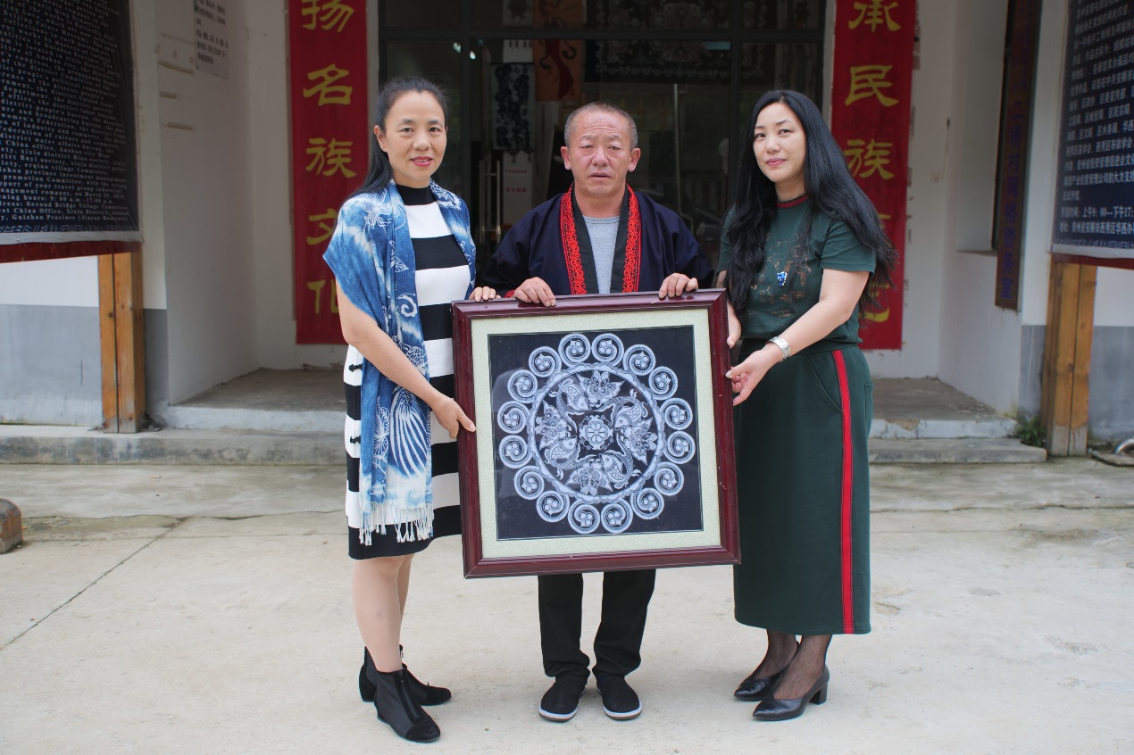 杨林老师喜欢高效办事低调做人,谈及他对当地贫困户和残疾乡亲的帮助,他都觉得不值一提。杨林对91官网 深怀感恩,去年91官网 团委在此设立91官网 实践基地(图7)。此次他得知老师要来回访,就在班级群中宣布要给母校捐赠自己的蜡染作品(图8)。非遗教研中心柯玲主任代表学校给他颁发了《捐赠证书》(图9)。安顺蜡染名声在外,杨林的作品,完成于1989年,纯清花色,《吉庆有余》寓意美好。回访杨林时,当地非遗管理部门领导因忙于脱贫攻坚无暇到场,但贵州省农林厅杨洪俊副厅长、西秀区妇联陈佳英主席以及工信局牟抗军科长等都到现场交流,介绍了贵州省多个部门分工协作进行非遗保护和非遗传承人群培训的概况,并希望91官网 能多给安顺绣娘以更多学习的机会。
