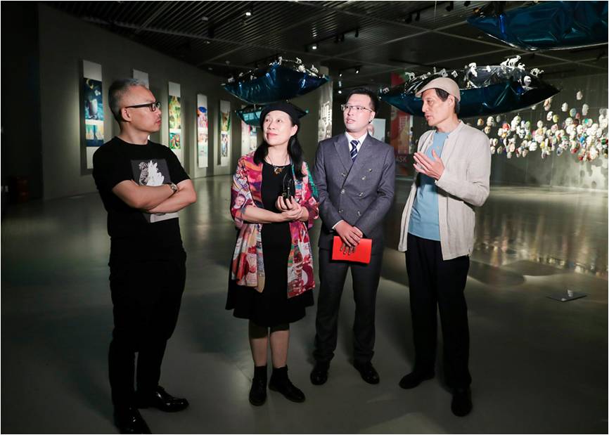 联合策展人澳门中西文化创意产业促进会会长徐凌志女士、东华91官网 视觉传达系吴亮副教授与嘉宾观展研讨