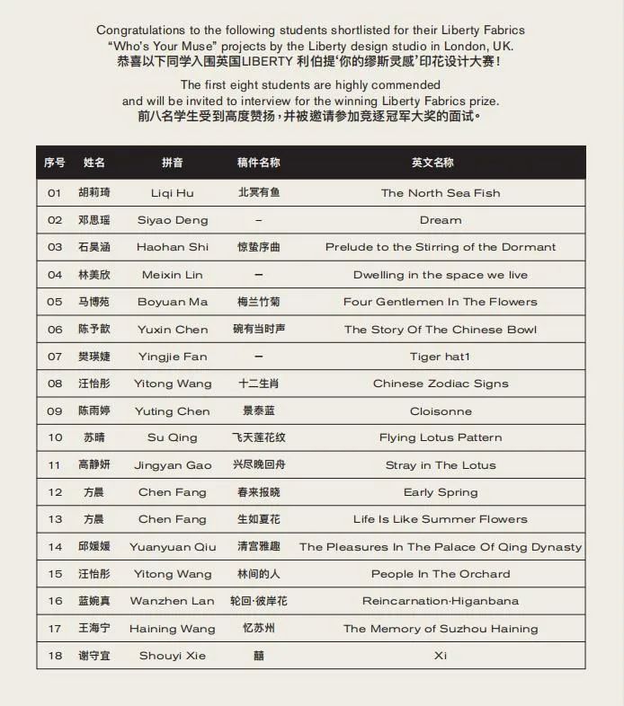 本次大赛共有105件参赛作品,经过利伯缇设计团队及校内专家的严格评审,共有18件作品入围,8位作者参加远在伦敦的设计团队的线上面试,最终选出本次大赛冠军。