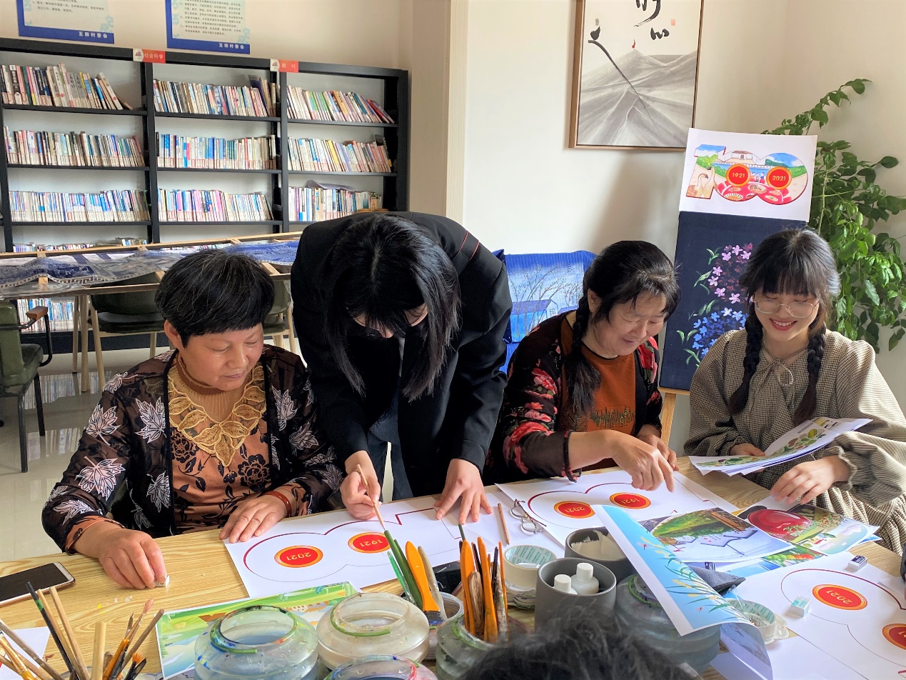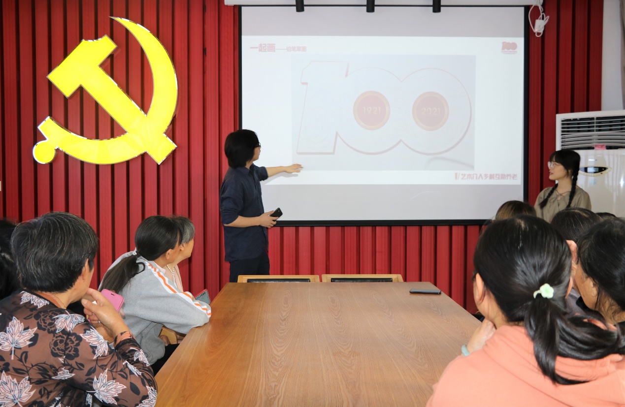 艺术设计第二党支部纪检委员吴春茂副教授结合积极应对老龄化、提升老年人主观幸福感和校地党建共建,为五四村村民介绍了本次活动的背景和意义。艺术设计二研究生党支部支部书记连梦菲为五四村老人讲解了本次共绘的创作步骤和技巧,启发老人们结合藏红花、水稻等五四村特有的风土人情,描绘建党百年之际自己心中的五四村。