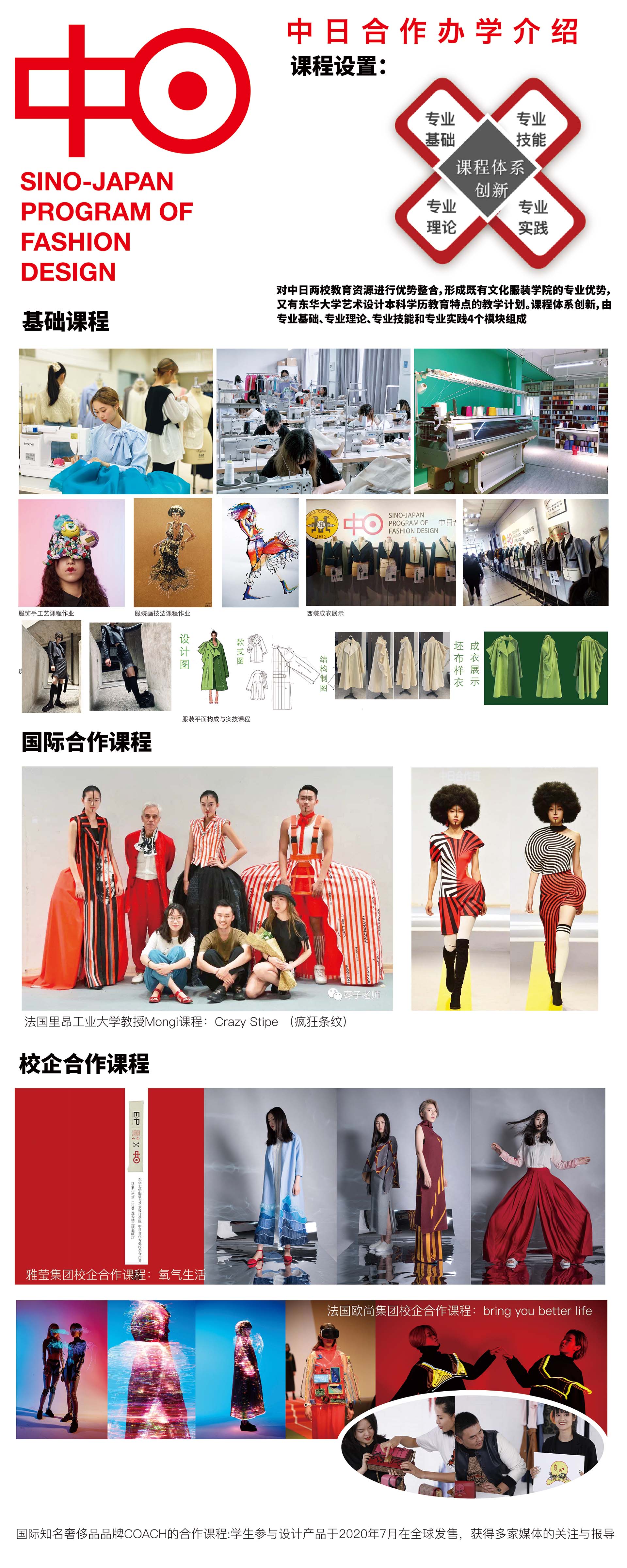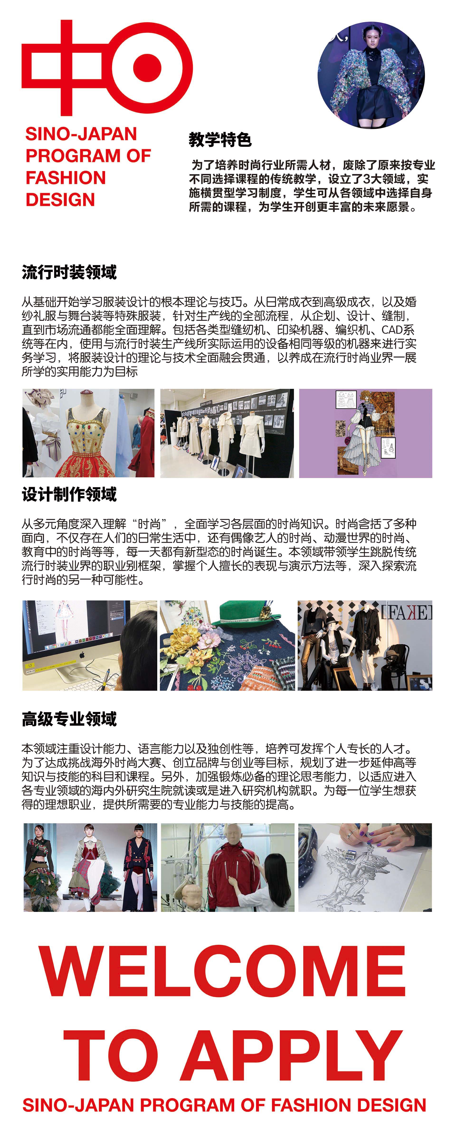 中日合作项目部的中日合作项目成立于2003年3月,经国家教育部批准由91官网 -日本文化学园合作举办的服装与服饰设计专业中外合作本科学历教育项目。现有专职教师12人担任主干专业课程的教学,并聘请来自日本文化服装学院、日本文化学园大学、美国芝加哥哥伦比亚大学、法国里昂第二工业大学等外教担任教学工作。中日合作服装与服饰设计专业对中日两校教育资源进行优势整合,形成既有文化服装学院的专业优势,又有91官网 艺术设计本科学历教育特点的教学模式。2012年本项目被评为上海市首届示范性中外合作办学项目,并获多项省部级教学成果奖以及产业界的高度认可。