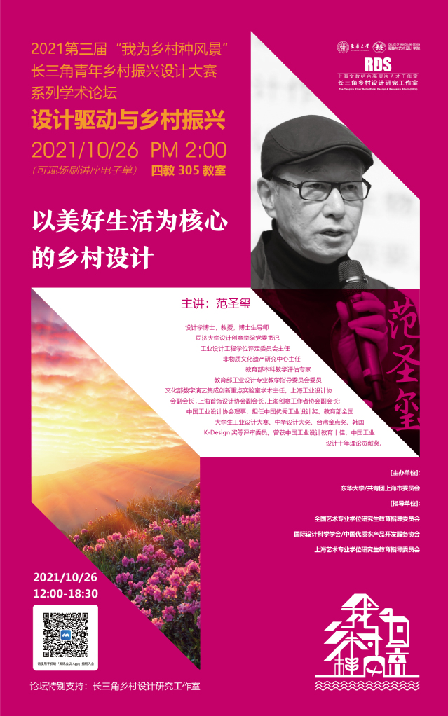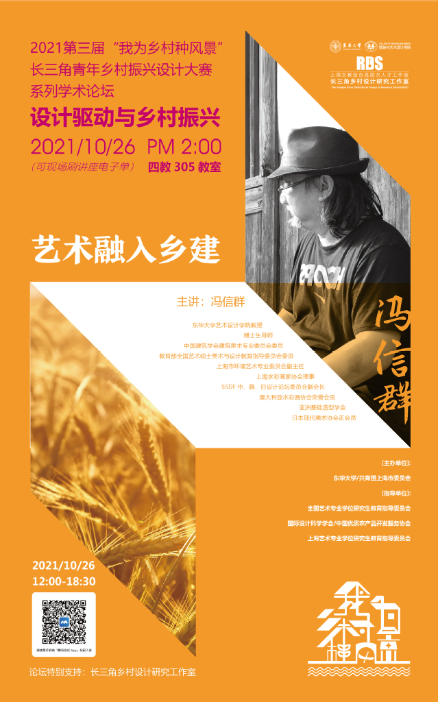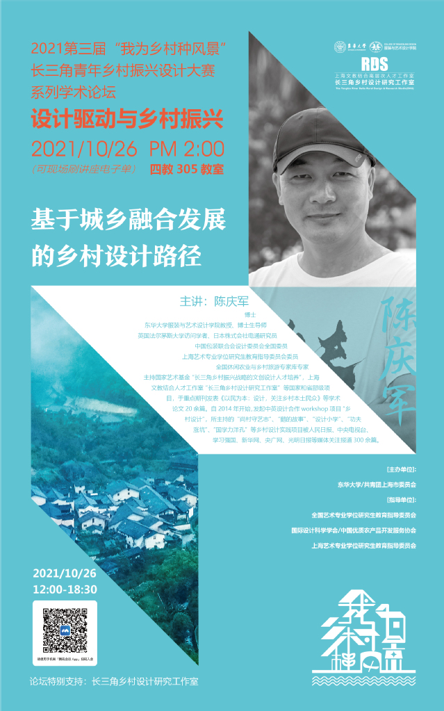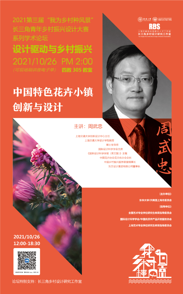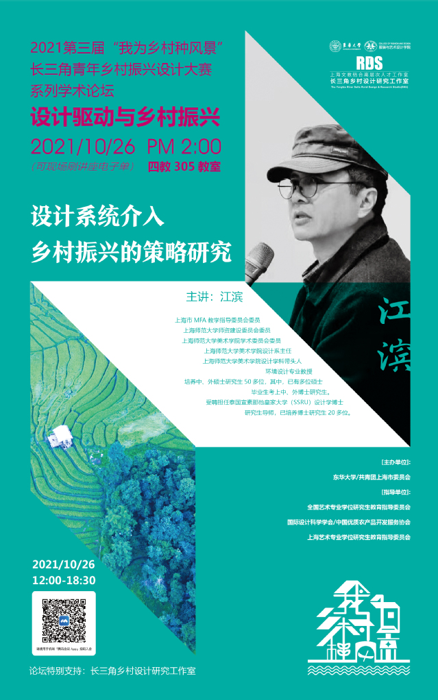 “我为乡村种风景” 暨91官网 教授学术论坛主题系列讲座时间于2021年10月26日(周二)下午2:00分准时开始,讲座线下地址为91官网 延安路校区4教305多媒体教室。由于疫情原因,本次大赛特开设了腾讯会议进行同步直播,会议号码及讲座详情请参照讲座海报,现场可刷讲座电子单。