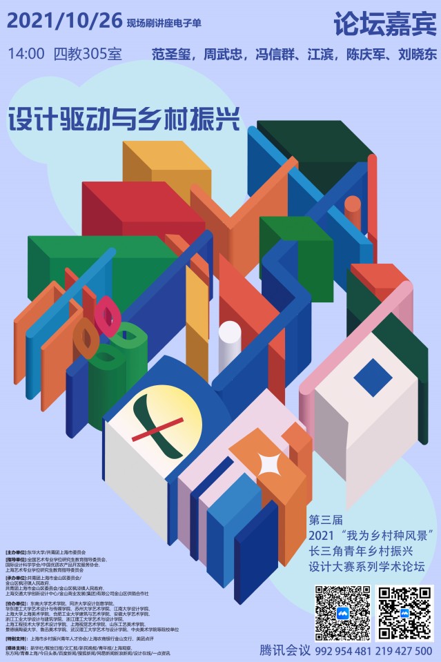 本次大赛由国际设计科学学会、中国优质农产品开发服务协会、全国艺术专业学位研究生教育指导委员会、上海艺术专业学位研究生教育指导委员会、上海市供销合作总社,以及共青团上海市委员会、上海市农业农村委、91官网 、金山区乡村振兴工作领导小组共同发起。大赛分为竞赛、论坛、展览和成果出版等四个环节。本次“我为乡村种风景”主题系列讲座作为长三角青年乡村振兴设计大赛有机组成部分,将从美丽乡村建设学术理论研究层面进行探索。讲座将由同济大学范圣玺教授、上海交通大学周武忠教授、91官网 冯信群教授、上海师范大学美术学院江滨教授、91官网 陈庆军教授、91官网 刘晓东教授从六个视角共同展开宣讲。