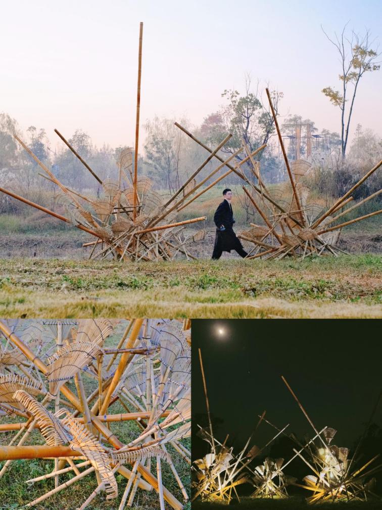 作品二蝴蝶效应》,设计师基于对“城市意向”的思考,“蝴蝶效应”折射着一种混沌现象,任何事物发展都存在其定数和变数,回味从城市到乡村的一次抽离,运用乡村材料“竹耙”为创作材料,搭配2-5米的竹竿,将城市的繁华以空间转译的手法投射到乡野的水岸边。夸张的装置形同快乐、野趣生长的芦苇。可预见的形态规律和不可测的生长轨迹矛盾且统一。