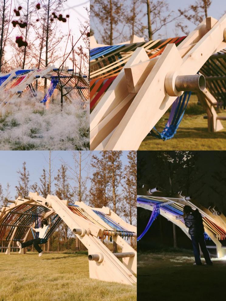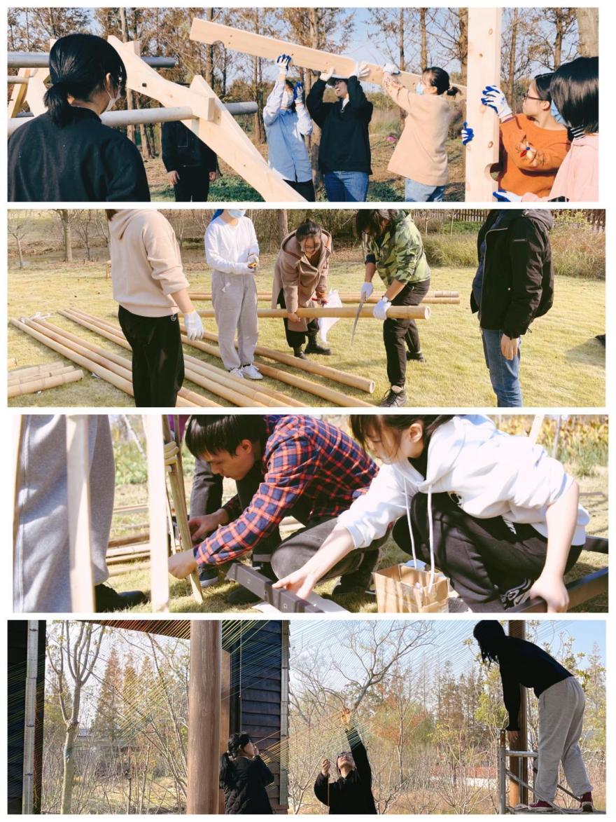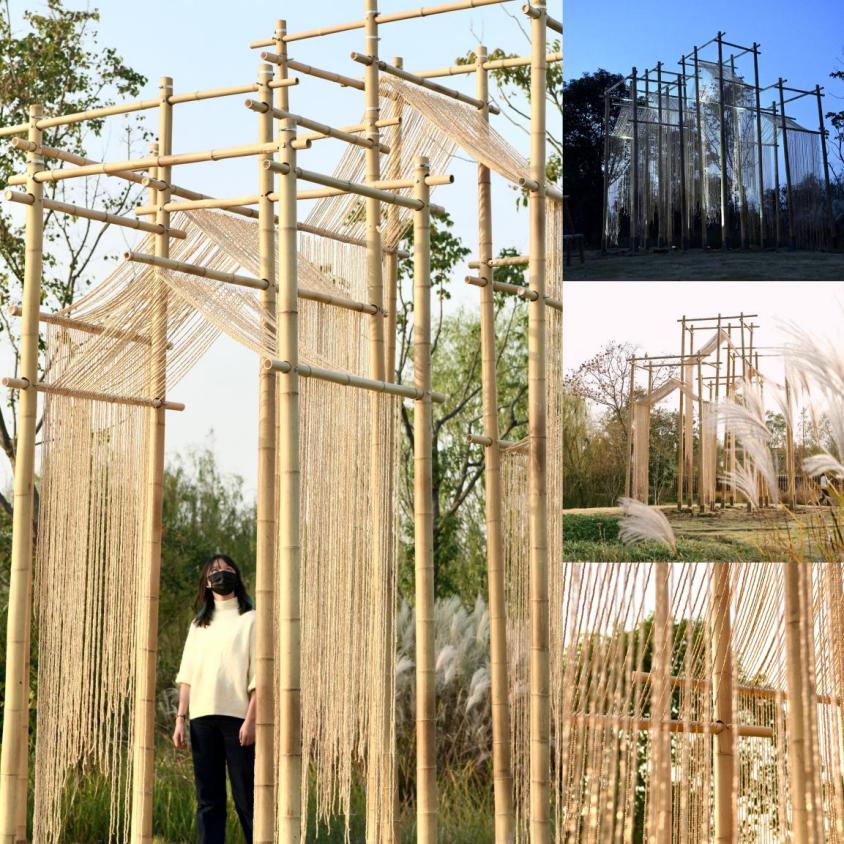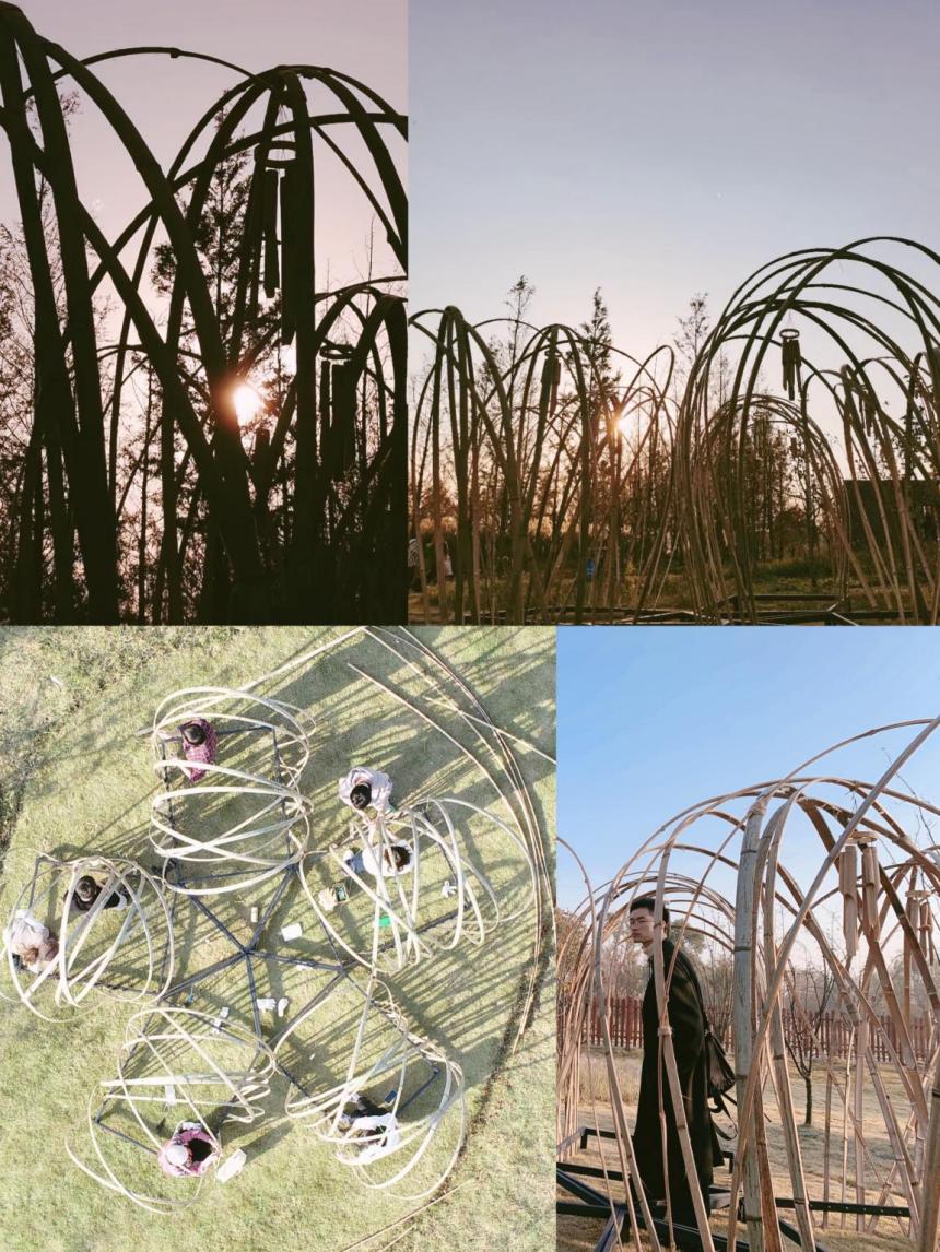 艺术搭建作品在崇明岛海棠湾最终落地呈现学生们以竹线等自然材料通过提前预制加工与定制配件以小组共同协作的方式2天时间内徒手合作搭建完成亲历了设计从概念到现实落地的整个复杂过程也感受到了亲自动手搭建的困难最终作品伴着乡村的晨雾完美的呈现