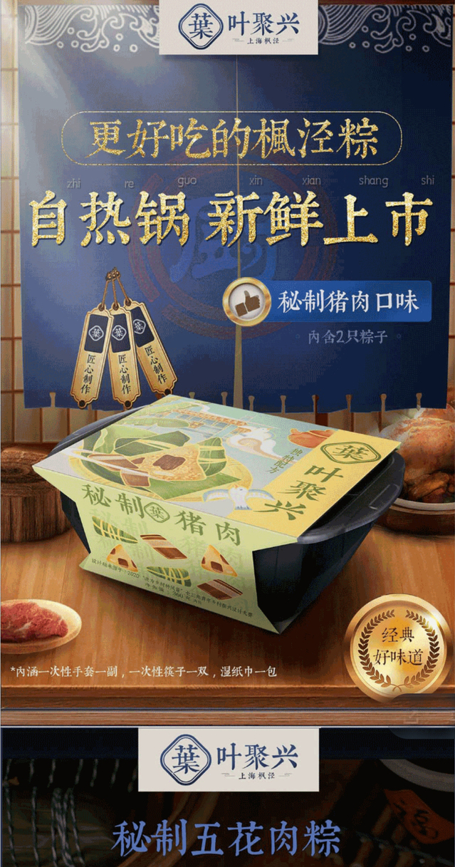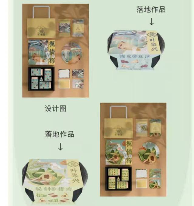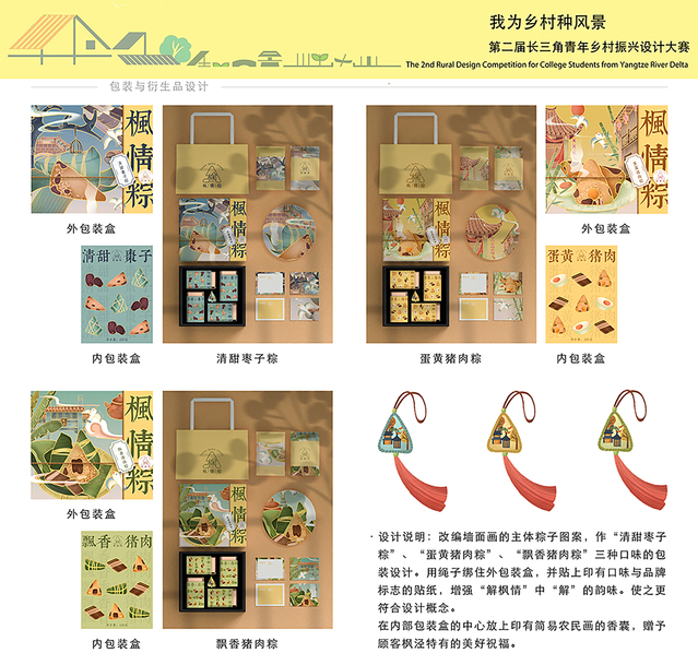 2020(第二届)“我为乡村种风景”长三角青年乡村振兴设计大赛物产类赛事围绕枫泾镇传统名吃“粽子”做为赛题,获得诸多青年设计师的持续设计关注,设计作品通过传统文化挖掘,提炼粽子符号,融入粽子故事,做出了大量有创意、有内涵、有思想的系列“粽子”系列视觉包装设计作品,收到当地粽子生产企业中意,并将部分设计作品变成落地成果。 “叶聚兴”作为金山枫泾镇当地一家有着较为悠久生产历史的粽子生产品牌,多年来一直注重产品创新,2020年将品牌发展设想放到“我为乡村种风景”长三角青年乡村振兴设计大赛平台,最终从多个创新设计作品中找到自己的产品包装与创意。