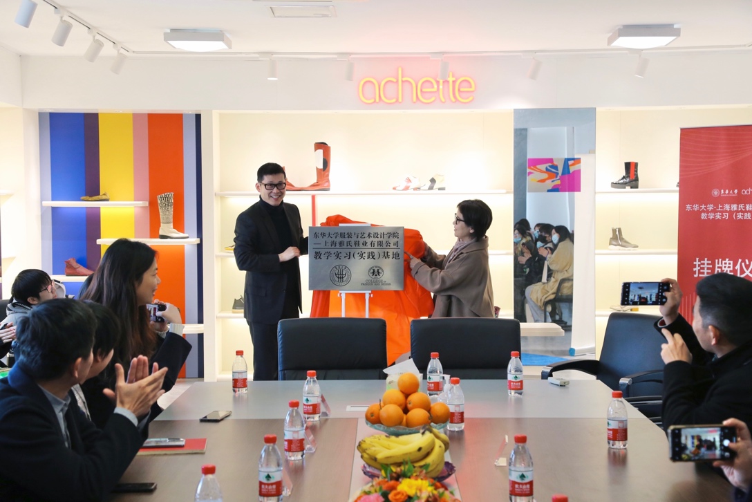 王朝晖教授也在最后挂牌仪式致辞中提出,一是中国饰配饰方向的人才更需要着力培养。中国现有的服装品牌趋近饱和,分类细致,在深度和广度上都有着相对应的研究,但是与服装设计相匹配的配饰品牌发展相对较弱,有很大的上升空间。二是在人才培养方面,需要设立切实可行的目标并且脚踏实地的行动。在人才培养上,投入与产出是呈正比的。东华与雅氏多年的合作经验和成果的积累就是最好的证明。三是表达了对企业提供平台的诚挚谢意以及对未来校企合成功的祝愿。希望以此为契机,通过校企合作,更好地激发人才的创新设计能力,培养更多鞋履设计方面的设计师。