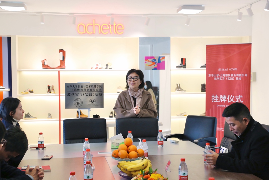 上海雅氏鞋业有限公司副总经理助理兼业务发展部经理江林翰女士作为雅氏的东华人代表在揭牌仪式中感谢东华的教导以及雅氏的培养。她说,作为东华校招的第一位同学,从市场部、销售部、业务发展部和生产部轮岗,业务类型从产品培训、订货会组织、销售管理、公司新项目的组织、公司新品牌的牵头负责人,在这工作期间,吃过苦、碰过壁、流过泪,但收获更多的是成长和快乐,也希望学弟学妹们:1)在校时间珍惜学习的好时光;2)走到哪里,都不忘自己是东华人。